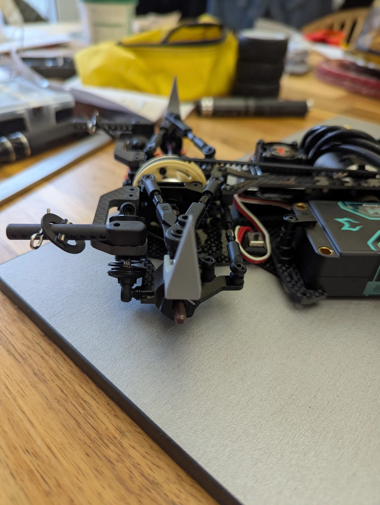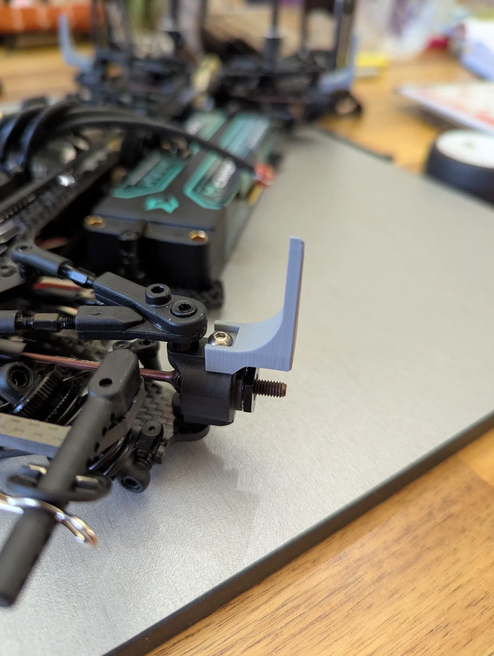Tool kẹp upright trước/sau cho Infinity Spec1ale, dùng chung với setup tool như Hudy/Arrowmax/SkyRC để có mốc đo caster sạch và lặp lại ổn định. Đọc góc bằng digital angle gauge hoặc inclinometer.