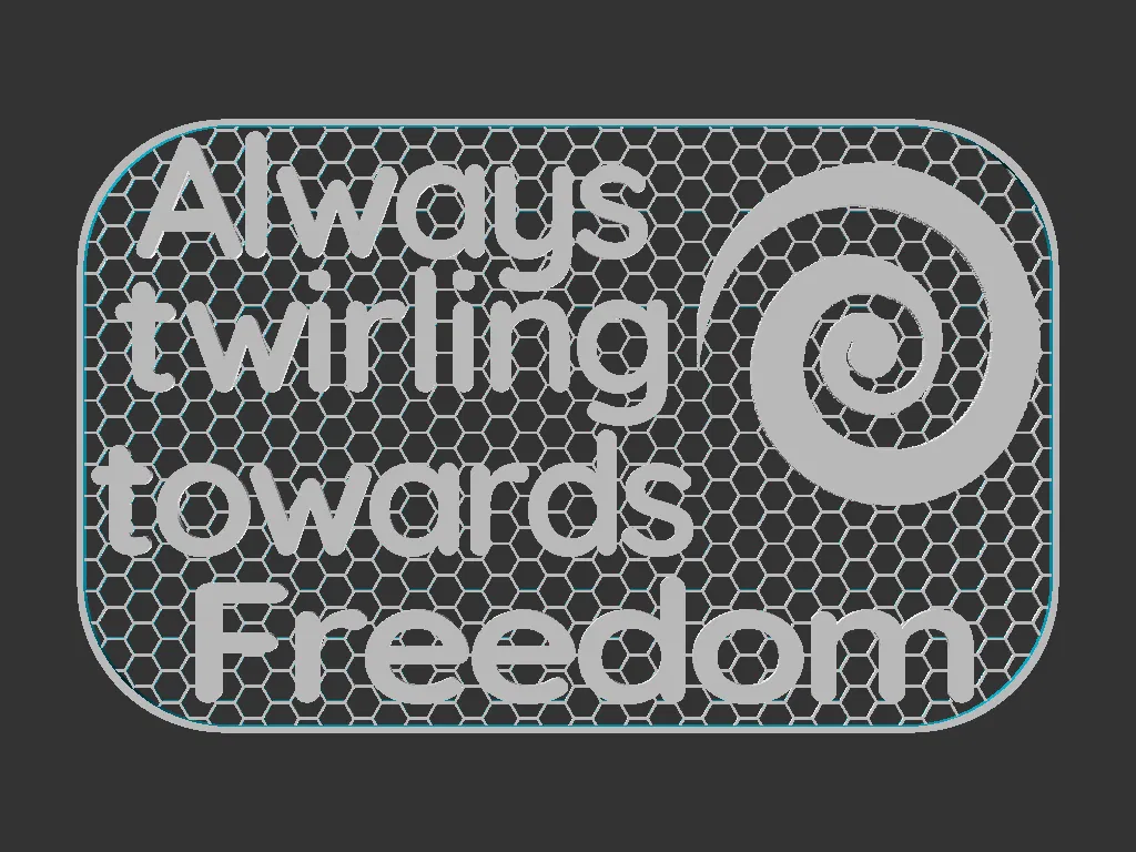 Bảng hiệu 100x160mm với dòng “Always twirling towards Freedom” và họa tiết xoắn ốc. Có model Mesh và Solid, khuyến nghị đổi màu sau 1mm (có kèm gcode). Phù hợp khi trưng trong Shadowbox Frames.