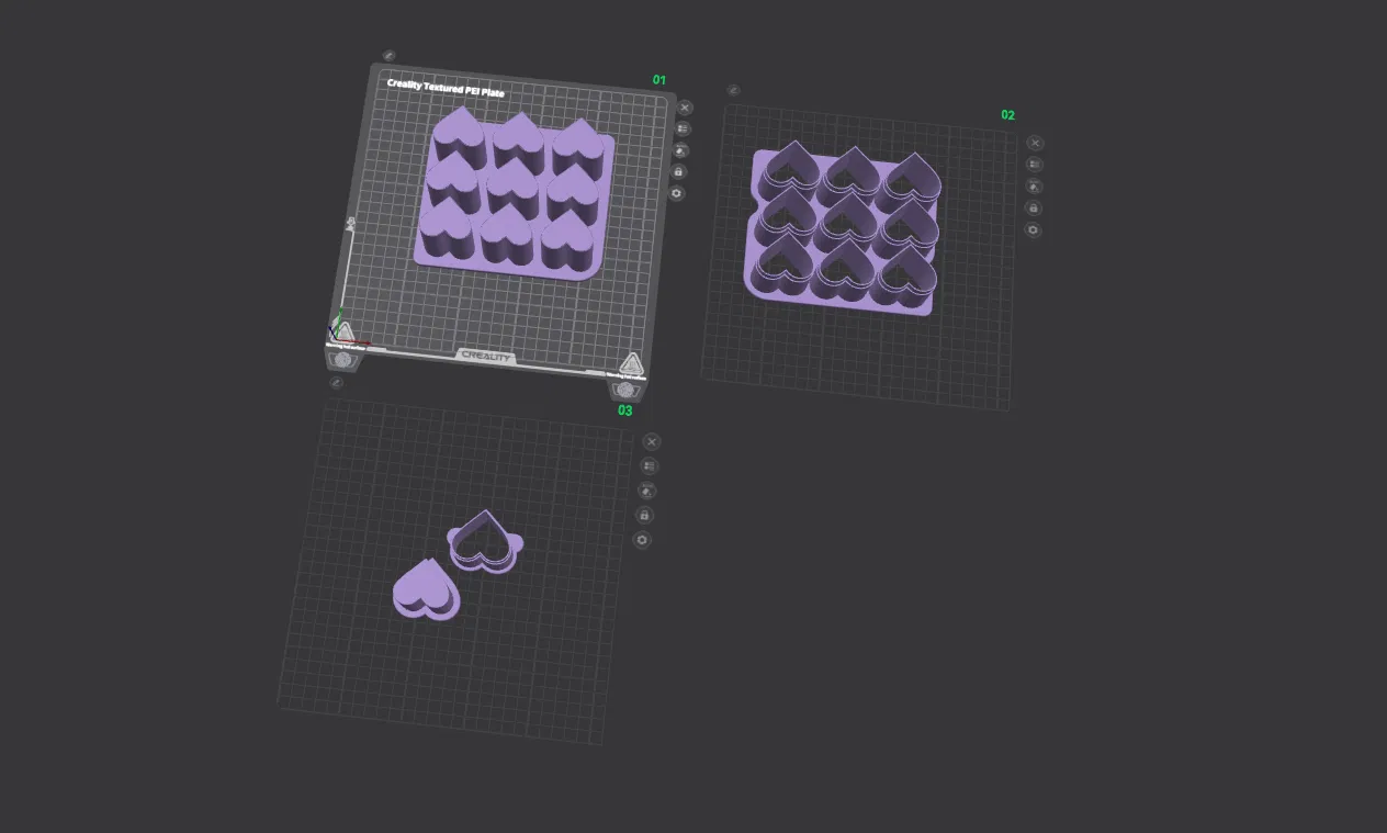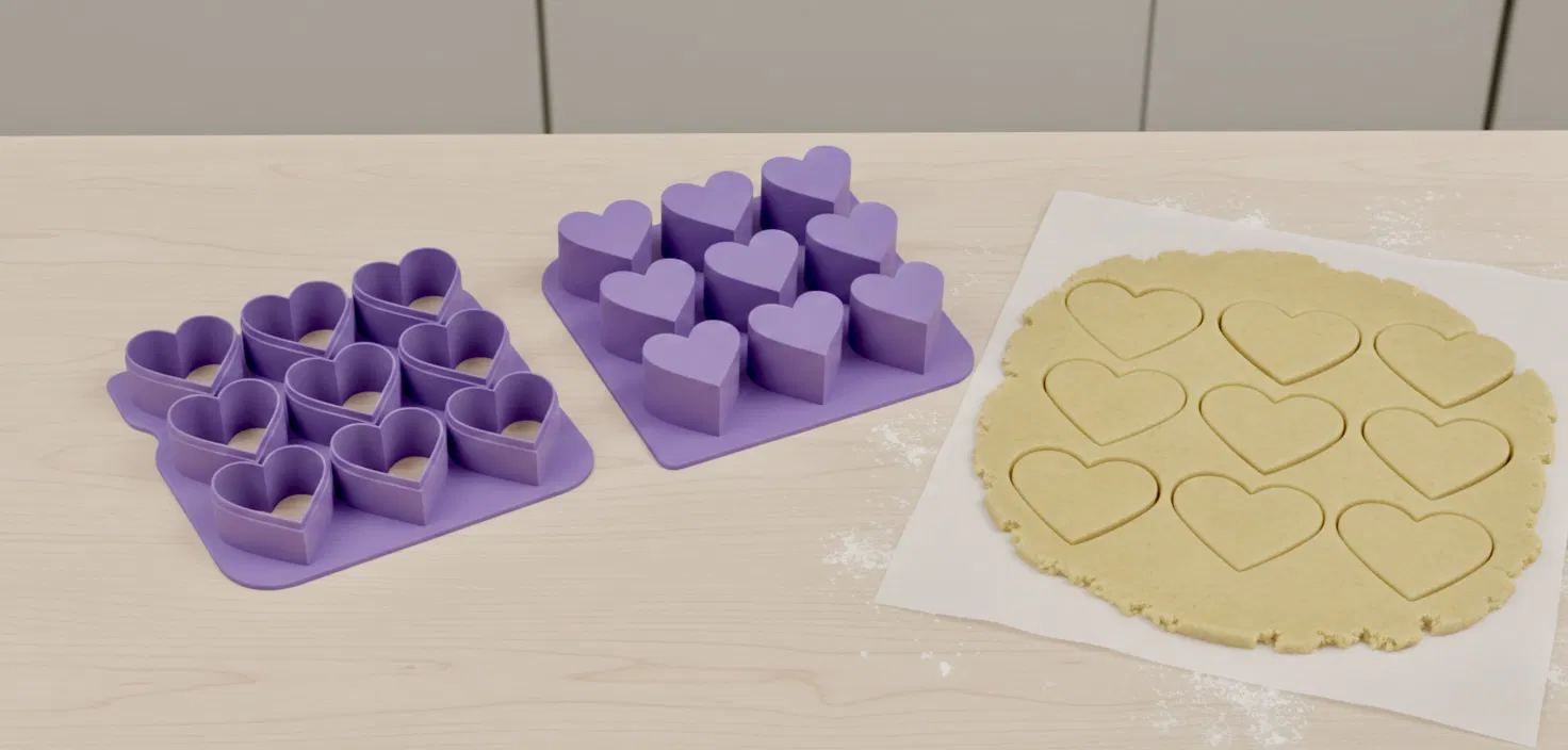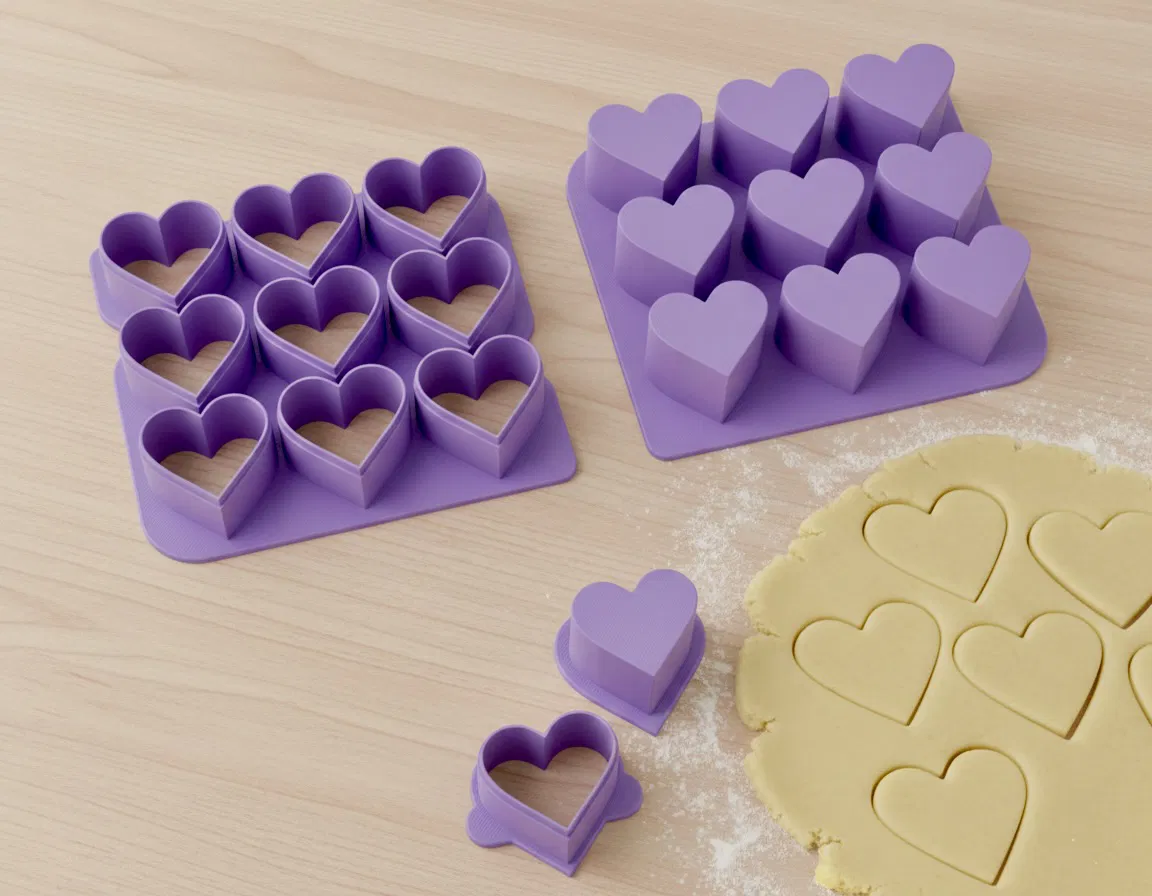 Bộ 9-in-1 in 3D gồm khuôn cắt lớn tạo 9 trái tim một lần và khuôn tim đơn, kèm pusher để lấy hình gọn đẹp. Dùng cho bột cookie, fondant hoặc cake pop. Khuyến nghị in PLA food-safe, layer 0.2mm, 2–3 walls, không cần supports.