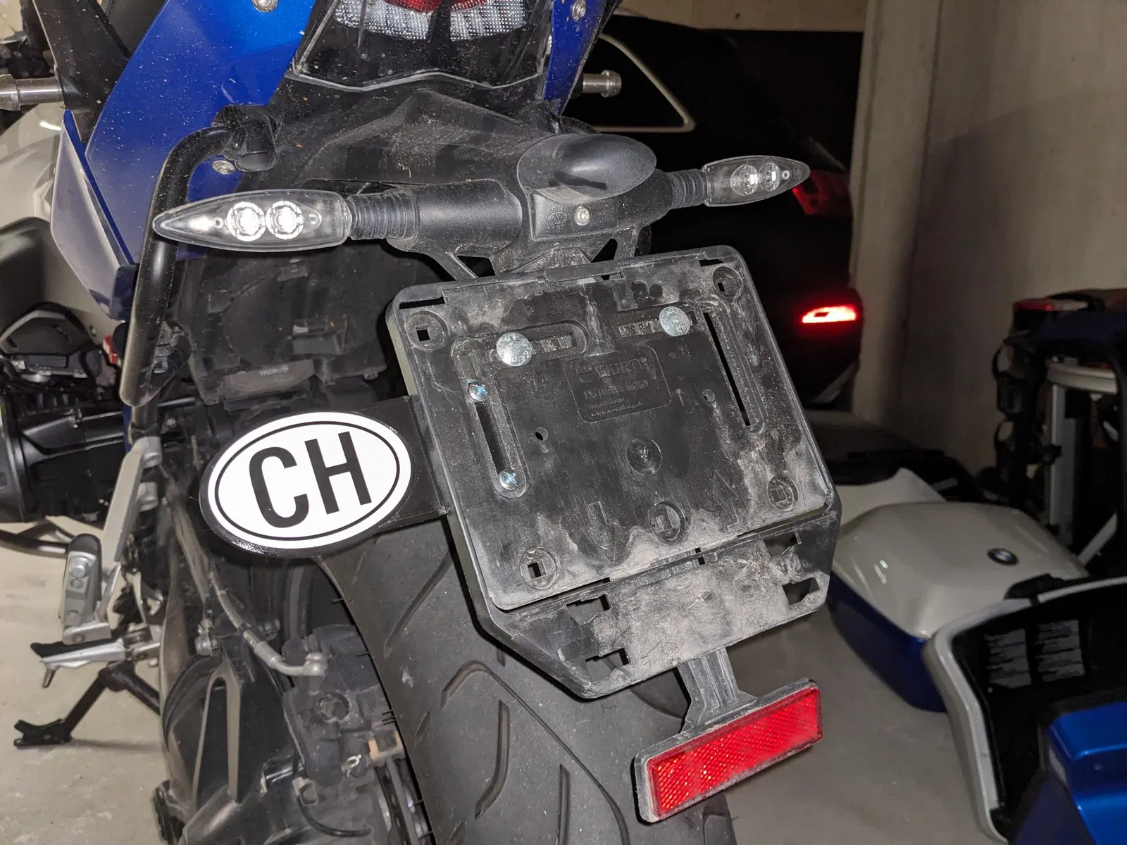 Điều này nên phù hợp với hầu hết các giá đỡ biển số tiêu chuẩn cho biển số Thụy Sĩ, cái này được bắt vít (với 2 đai ốc và bu lông M5) vào chiếc BMW R1200RS của tôi, nhưng nó cũng phù hợp với giá đỡ biển số của chiếc Yamaha MT07 của tôi.