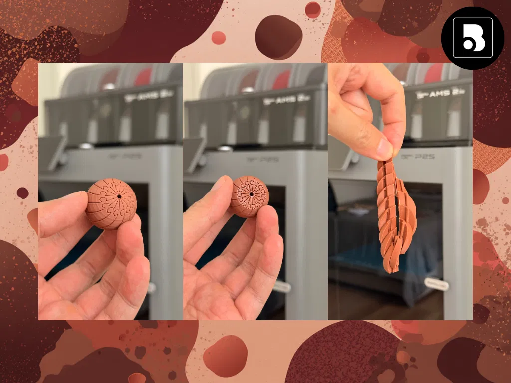 Fidget mini dạng twisty lấy cảm hứng từ viên chocolate tròn, print-in-place nên không cần supports. Rộng 30mm, kéo là nở thành xoắn ốc double-helix mượt, đã tay và có “click” nhẹ để giảm stress, tăng tập trung.