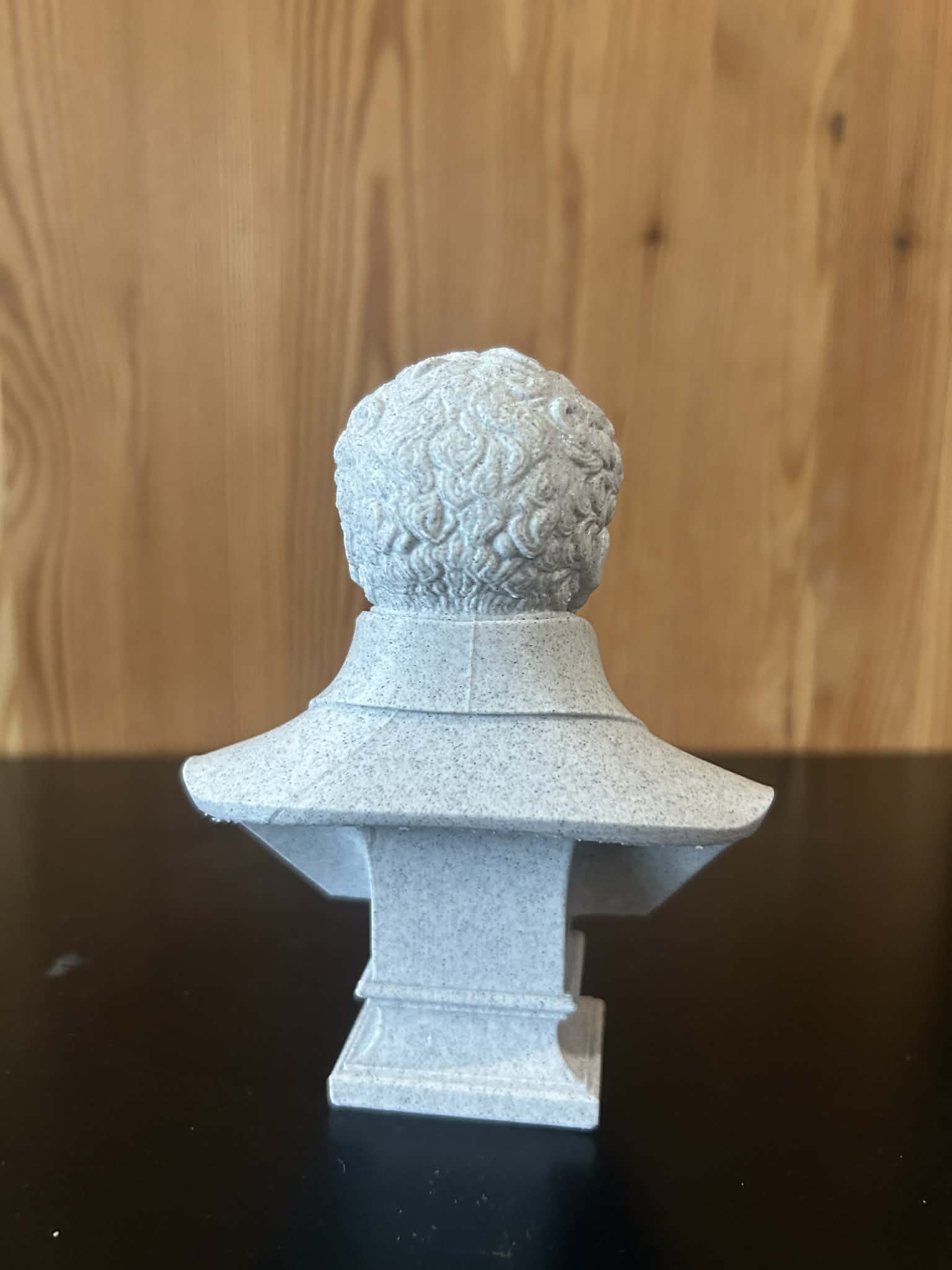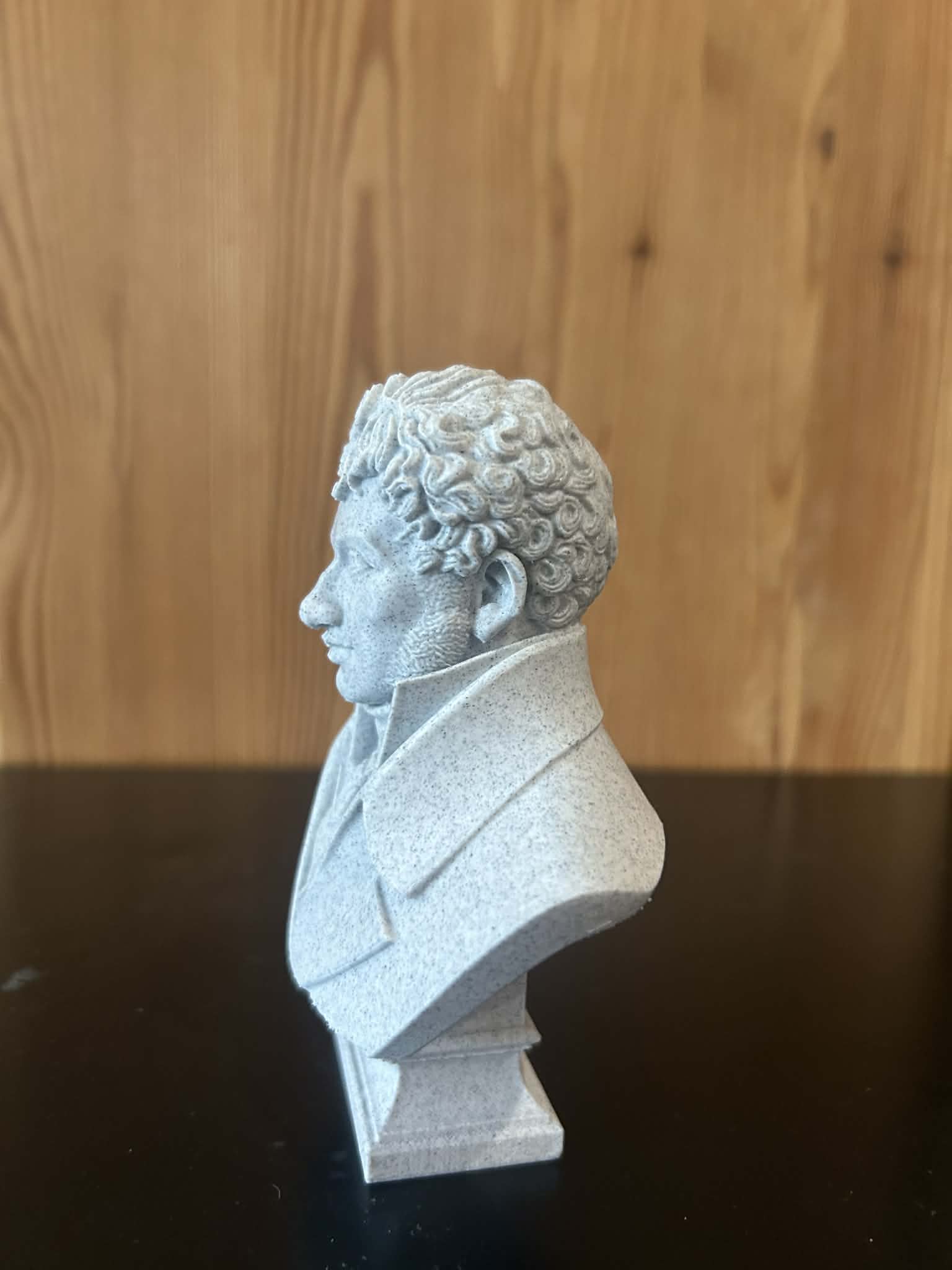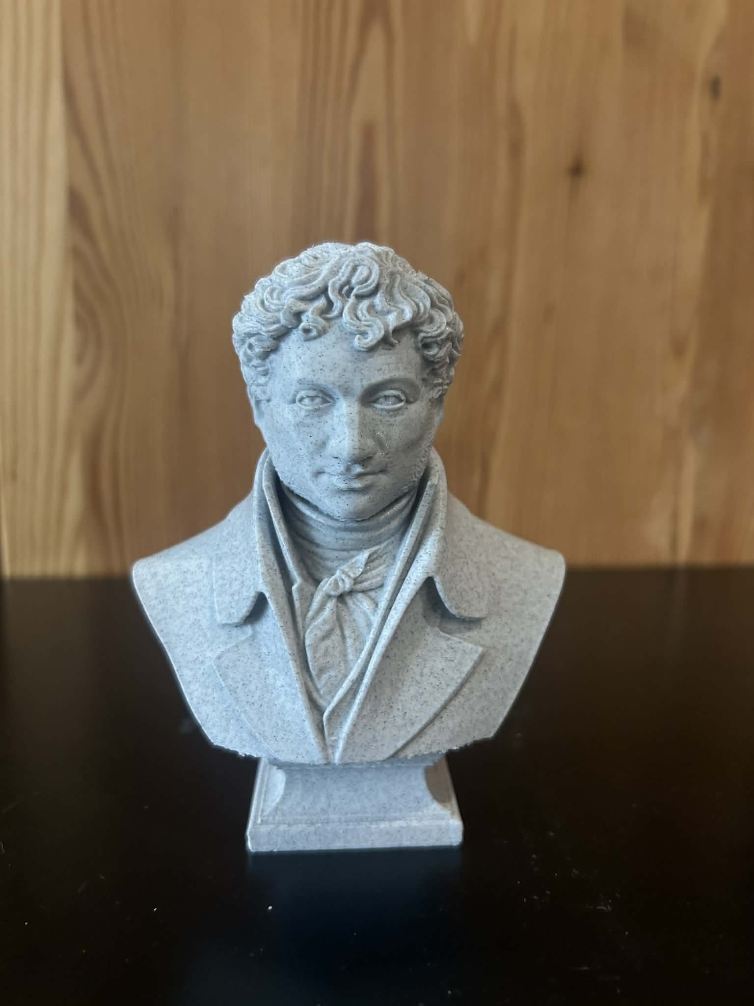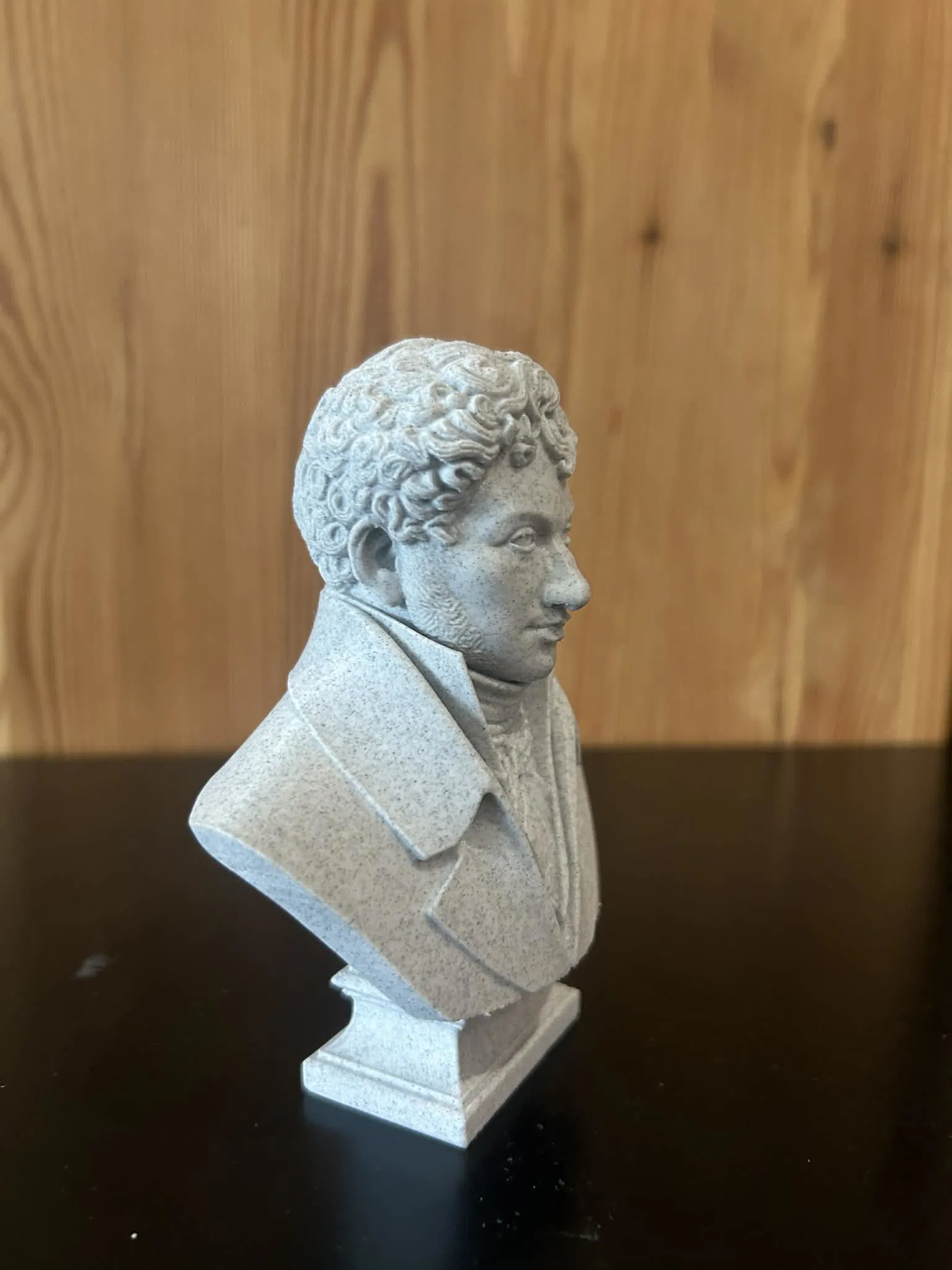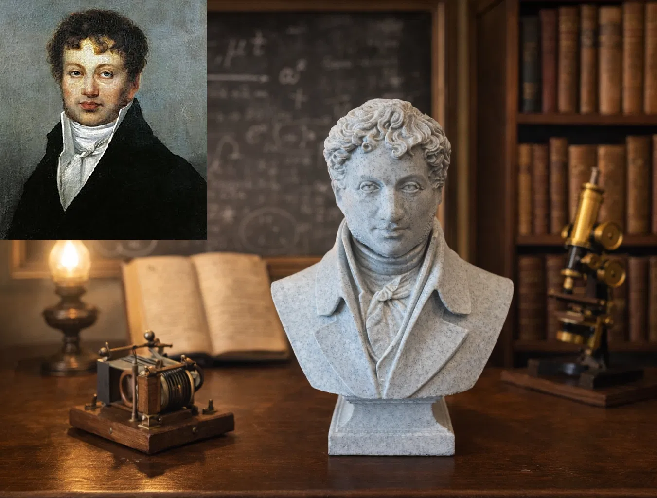 Tượng bán thân này khắc họa André-Marie Ampère, nhà vật lý và toán học người Pháp, được xem là một trong những người đặt nền móng cho ngành điện từ học. Tác phẩm đi thẳng từ chân dung nổi tiếng nhất của ông và tái hiện rất sát các nét đặc trưng: gương mặt nghiêm nghị, đậm chất suy tư, cùng dáng vẻ điềm tĩnh gợi tinh thần khoa học của thế kỷ 19.