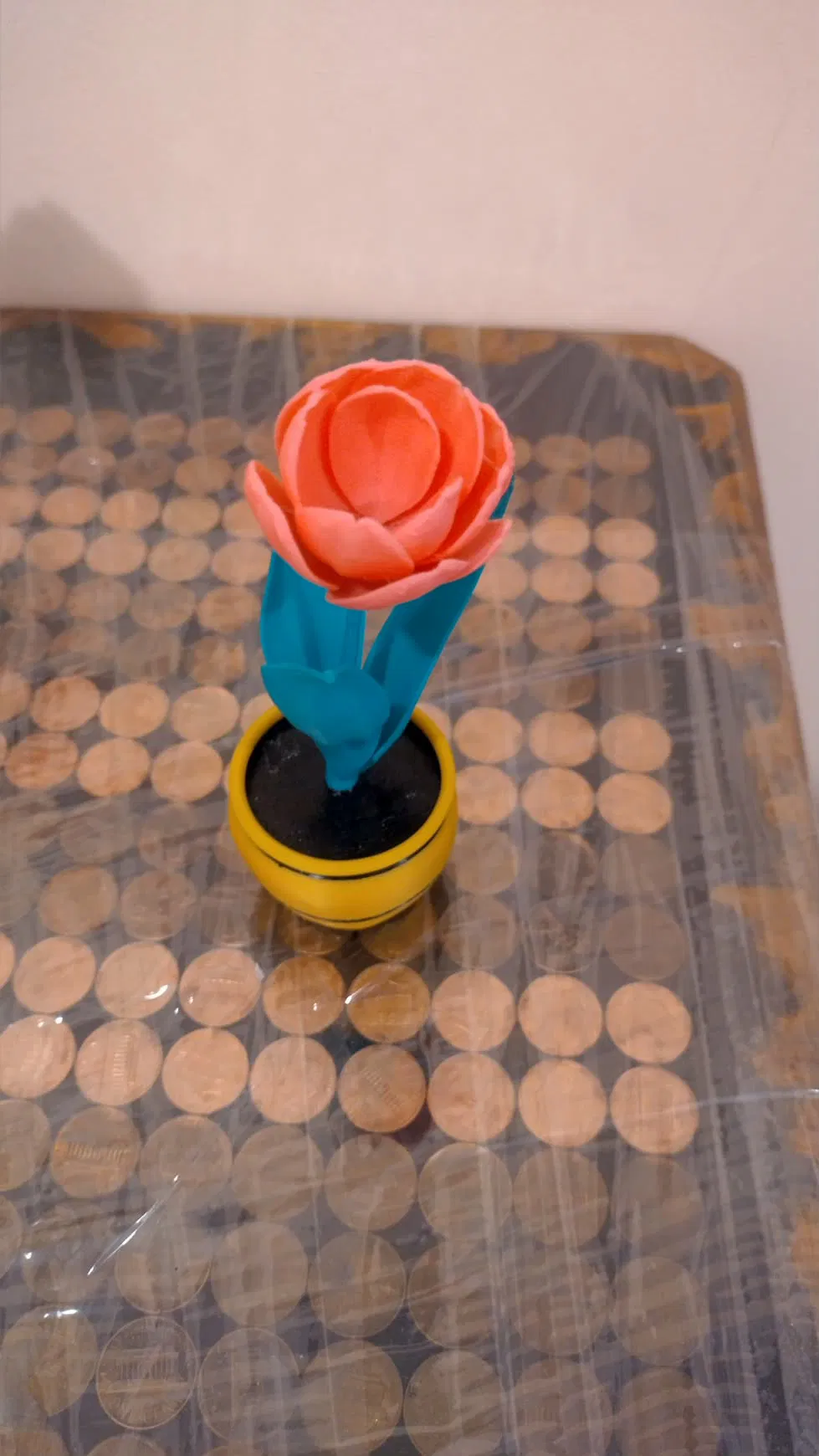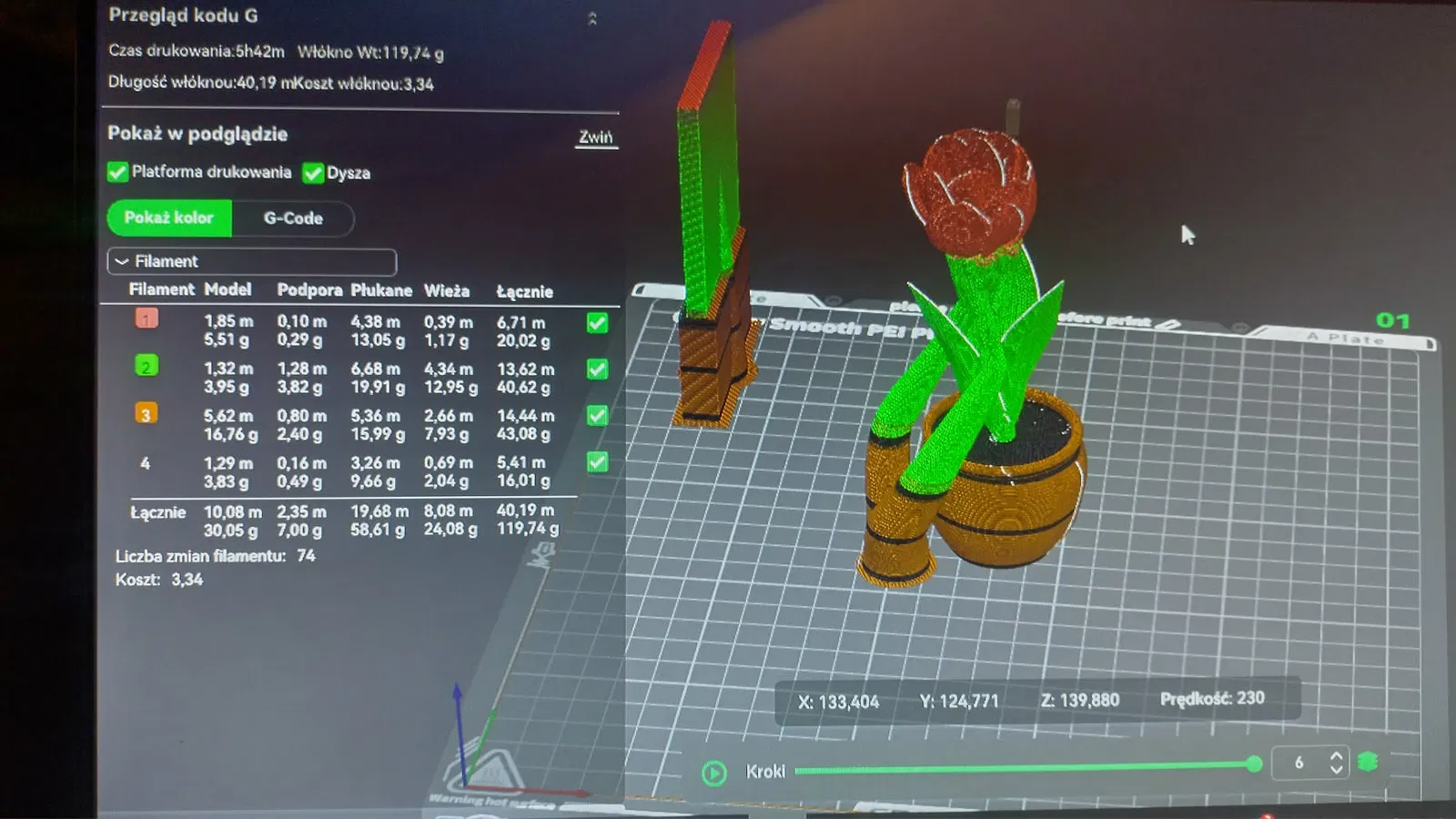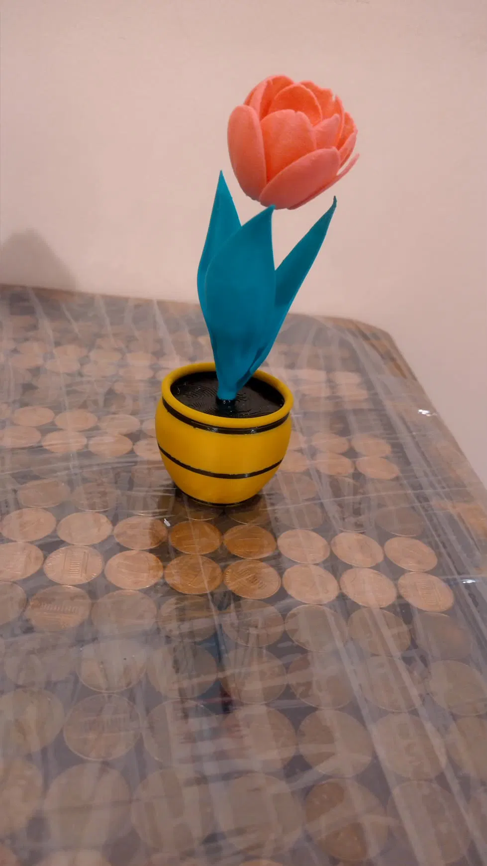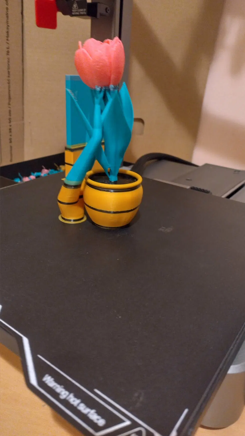 Mẫu Tulip (hoa tulip) dùng Sunlu PLA và Sunlu PETG (đen), in trên Creality Hi Printer với nozzle 0.4 mm. Thời gian in 5 giờ 42 phút, dùng tree-shaped supports, tổng filament khoảng 120 g.