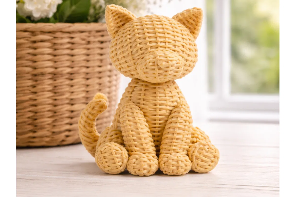 Được thiết kế theo phong cách đan mây (wicker), toàn bộ mẫu mô phỏng những sợi mây/rattan đan khít nhau, tạo cảm giác ấm áp với tông màu mật ong như đồ thủ công đan lát, đồng thời vẫn thấy rõ độ chính xác theo từng lớp của in filament. Mỗi “sợi” trông như được đan rất kỹ, chạy liền mạch qua phần đầu tròn, đôi tai dựng và chiếc đuôi cong nhẹ.