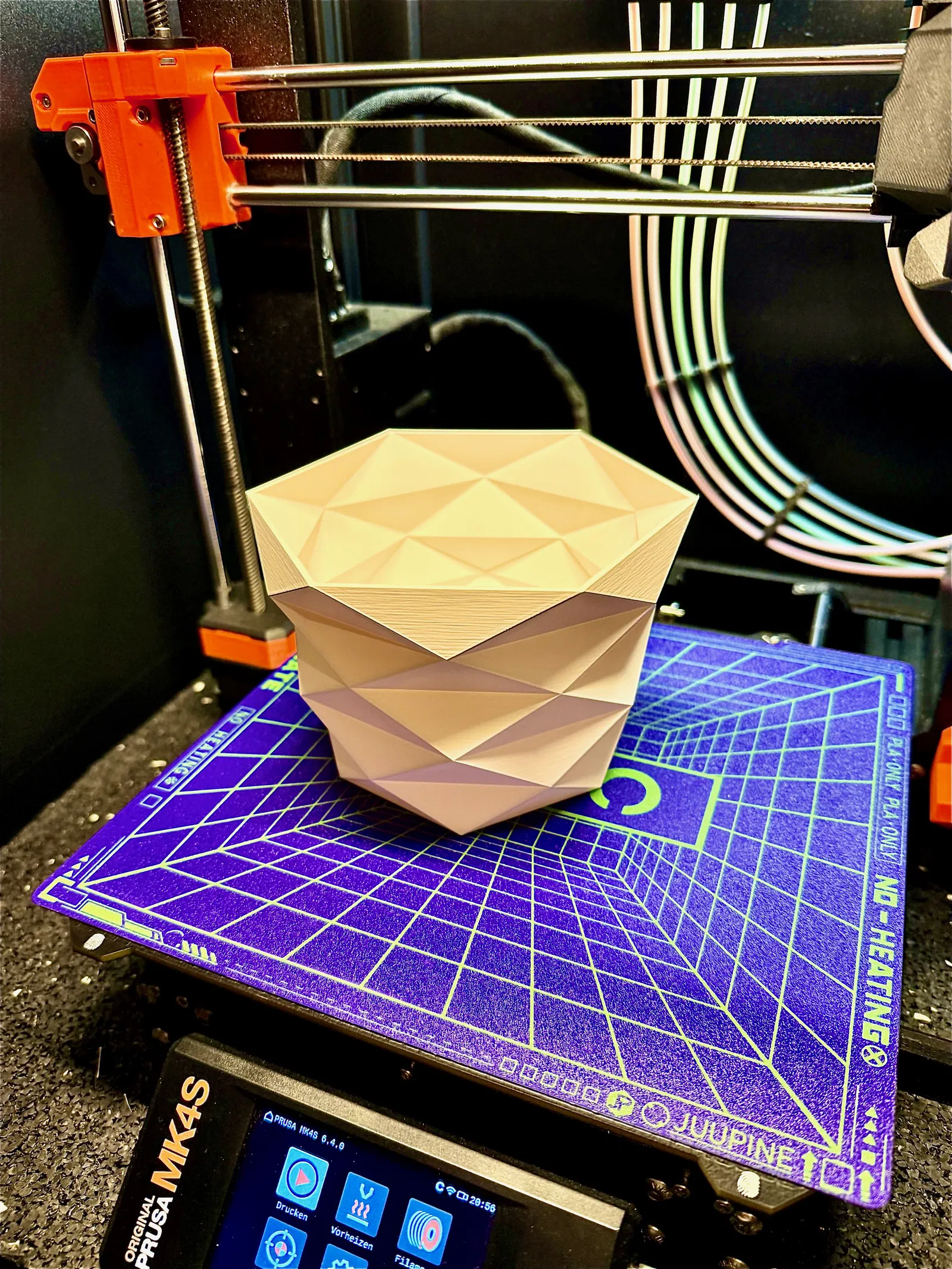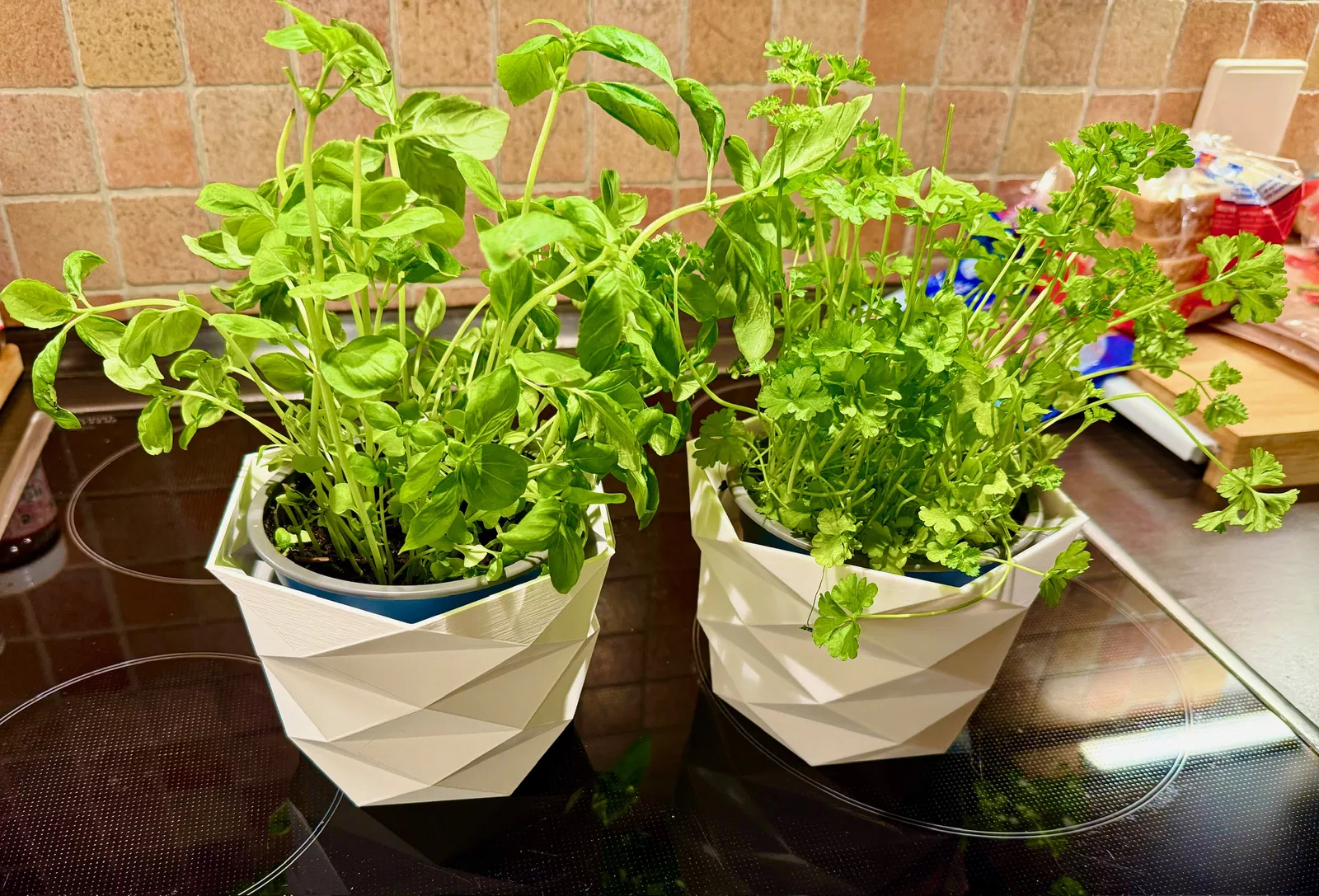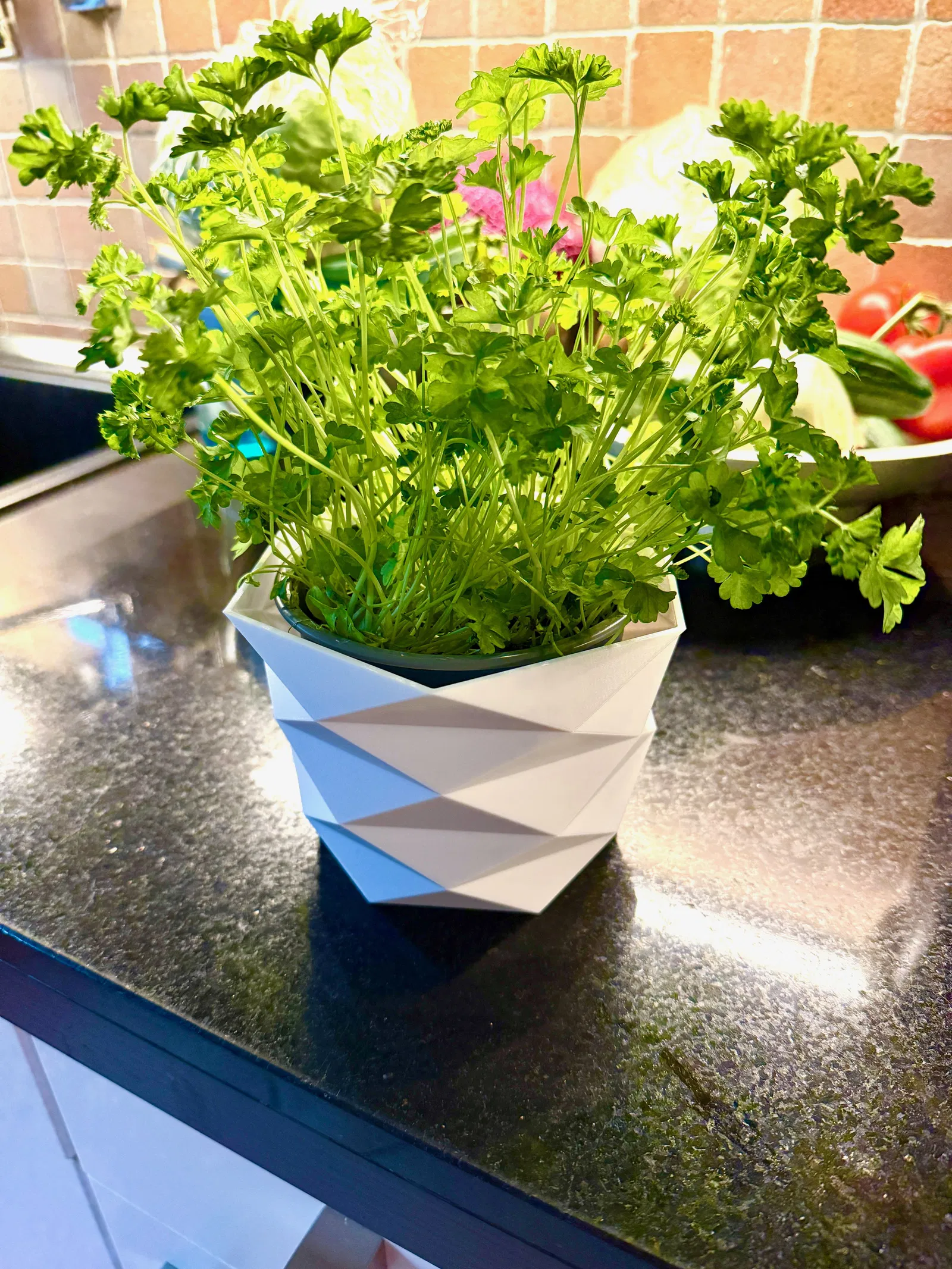 Low Poly Übertopf (chậu bọc kiểu low poly) dành cho rau thơm trồng vườn. In bằng Sunlu PLA trắng trên Prusa MK4S + MMU3. Structual Mode, layer 0,2mm khoảng 6 tiếng. Vừa chậu basil/parsley mua sẵn; chưa test chống thấm.