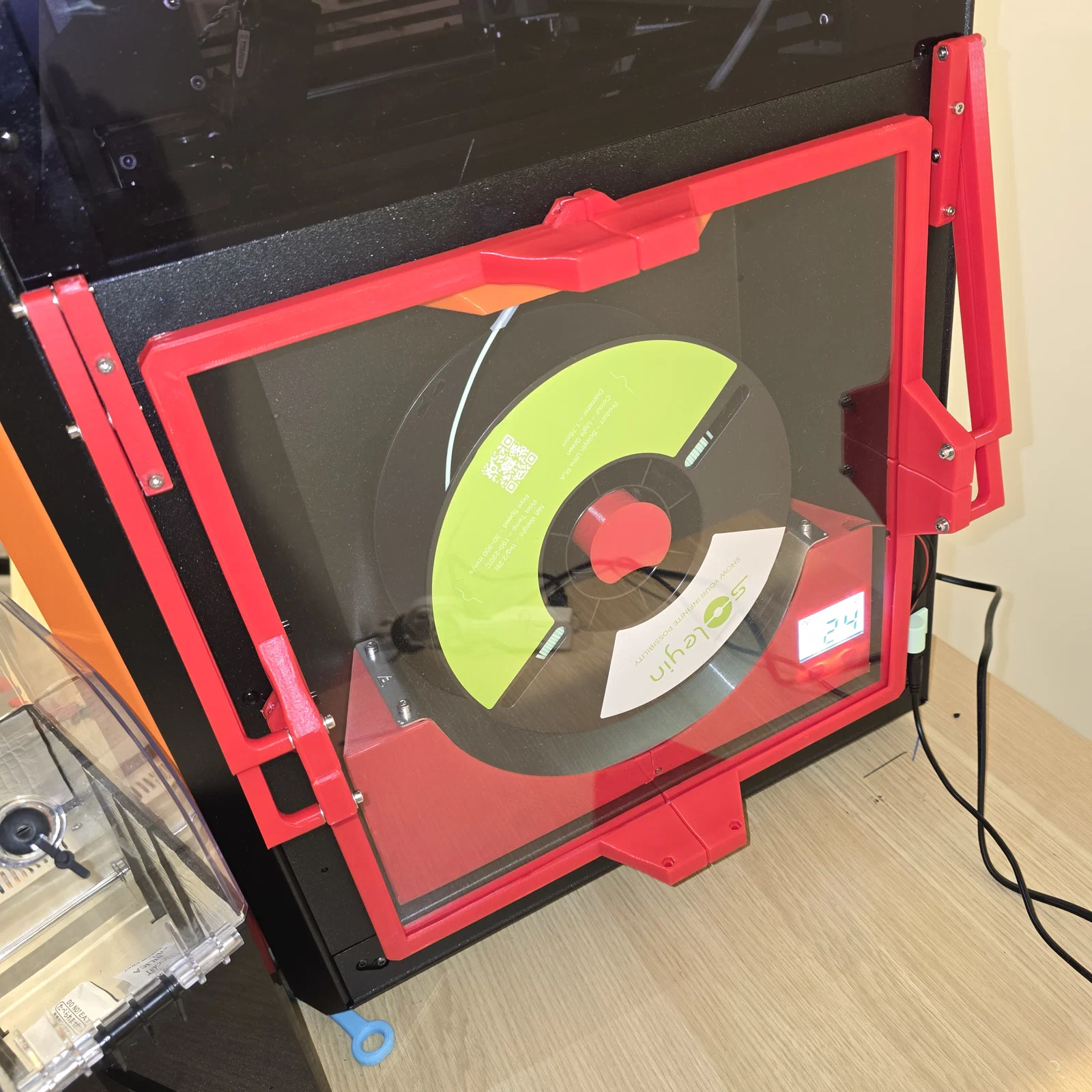 Bản mod biến filament holder của Core One thành hộp sấy filament có gia nhiệt, dùng SUNLU S1 (modified). Hộp lên khoảng 50C trong vài phút, không kín hoàn toàn để thoát ẩm; có thể dùng kèm desiccant.