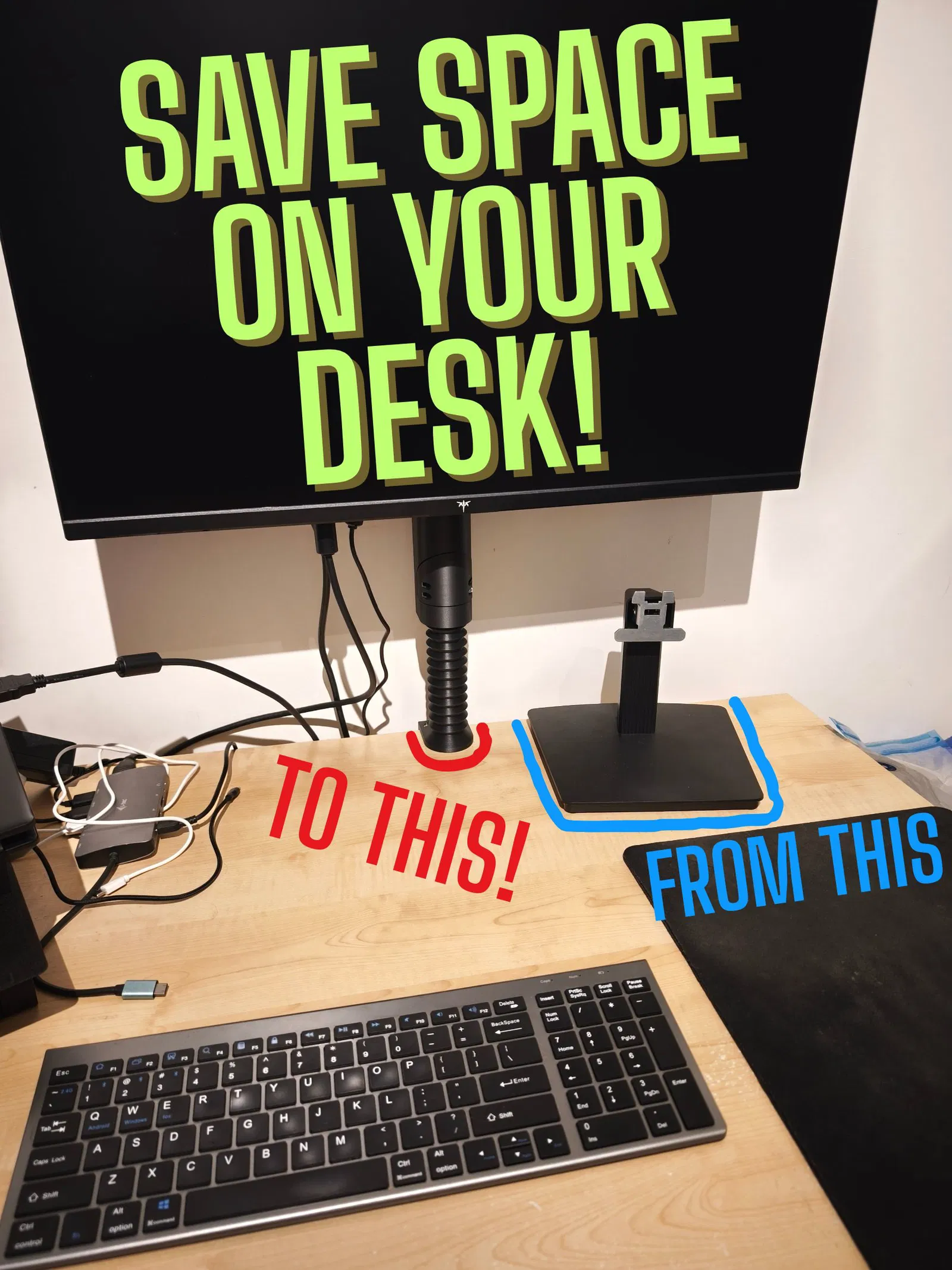 Chân đế màn hình 3D in hoàn toàn, footprint siêu gọn giúp tiết kiệm diện tích bàn. Hỗ trợ chỉnh height, rotation và tilt (-/+20°), tương thích VESA 75/100. Có bản 250mm & 320mm, phù hợp đa số máy in.