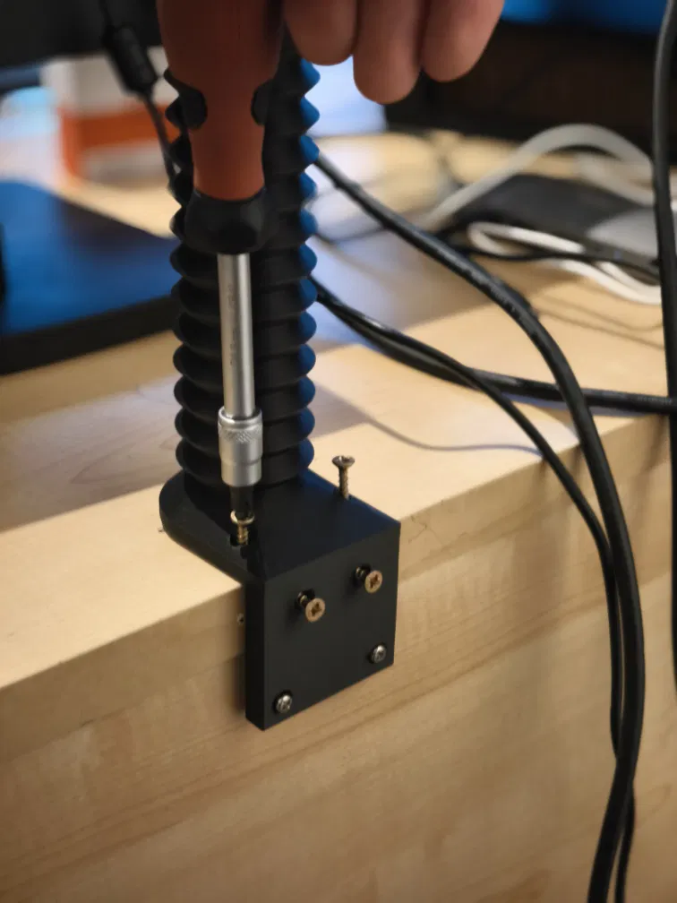 Bắt chặt "InnerShaft.stl" xuống mặt bàn bằng vít gỗ. Mình dùng vít 3.5 x 10mm (6 con). Nếu bạn muốn màn cao và có máy in lớn, có thể dùng "320mm_Innershaft.stl". Nếu muốn màn thấp hơn hoặc máy in nhỏ, nên dùng "250mm_Innershaft.stl"