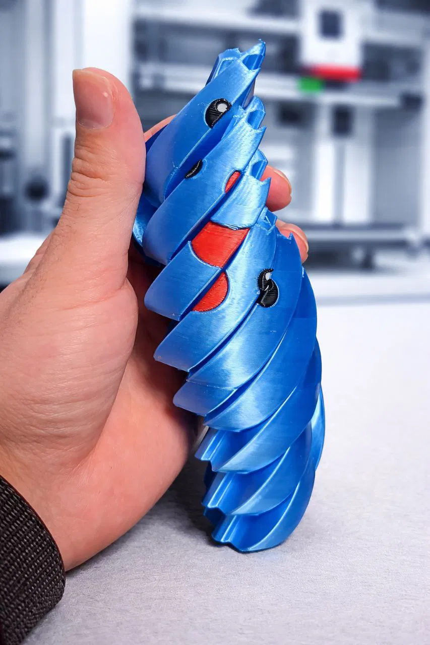 Mẫu fidget slime smiley dạng mở rộng này có form lấy cảm hứng từ slime vui nhộn, kèm gương mặt cười dễ thương. Cấu trúc nhiều khúc (segmented), articulated giúp mẫu co giãn mượt mà, tạo chuyển động kinetic kiểu “mềm nhũn” giống slime — nhưng ở dạng 3D-printed gọn gàng, sạch sẽ.