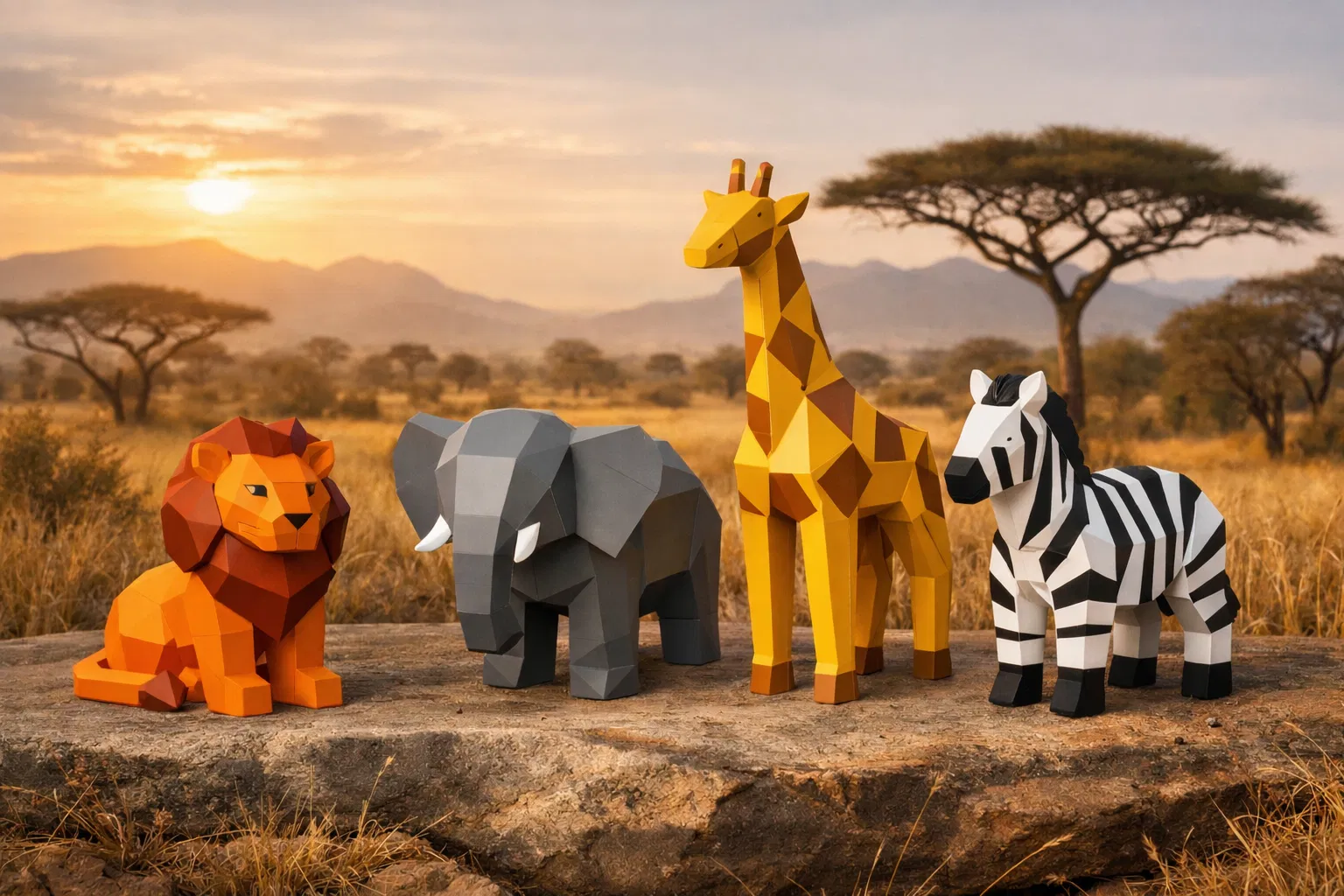 Bộ Thú Safari Abstract Minimal (Low Poly) – 4 Mẫu: Sư tử, Voi, Hươu cao cổ, Ngựa vằn