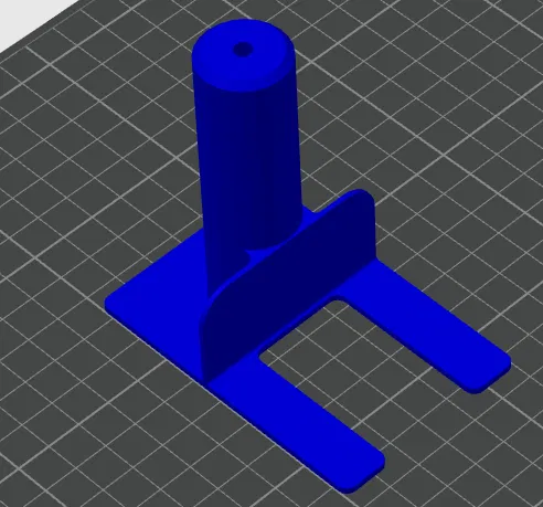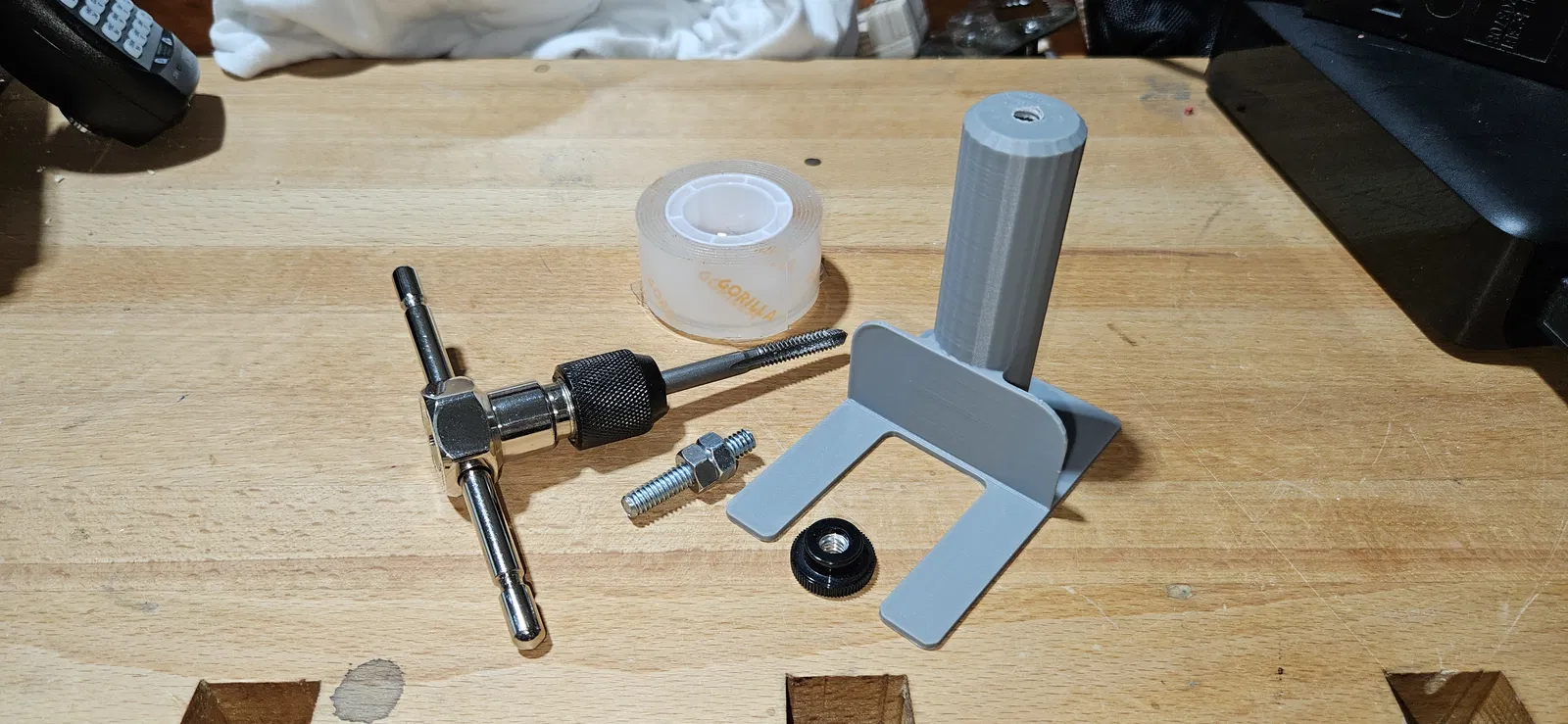 Thiết kế này dùng ren ta-rô ¼-20. Mình cắt đoạn ren từ một con bolt 1.5" và dùng thêm một thumb-jam nut. Nó được thiết kế để ôm/straddle cái chân trước bên trái, và mình dùng băng keo 2 mặt Gorilla để dán nó vào hông của cái Hi.