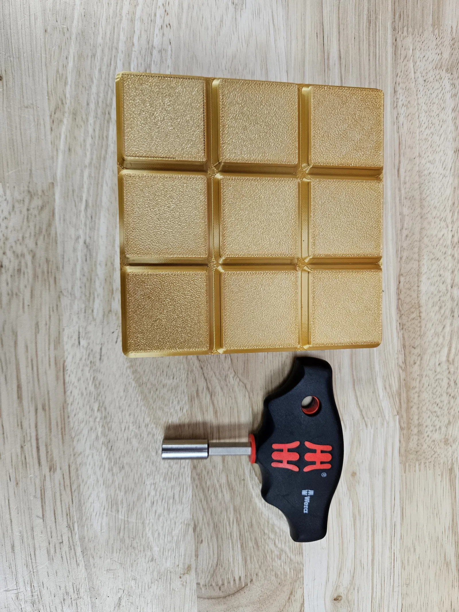 Khay (bin) Gridfinity 3x3 cho tay cầm chữ T Wera. Mẫu tay cầm chữ T cụ thể này lấy từ bộ Wera Advent Calendar 2025.