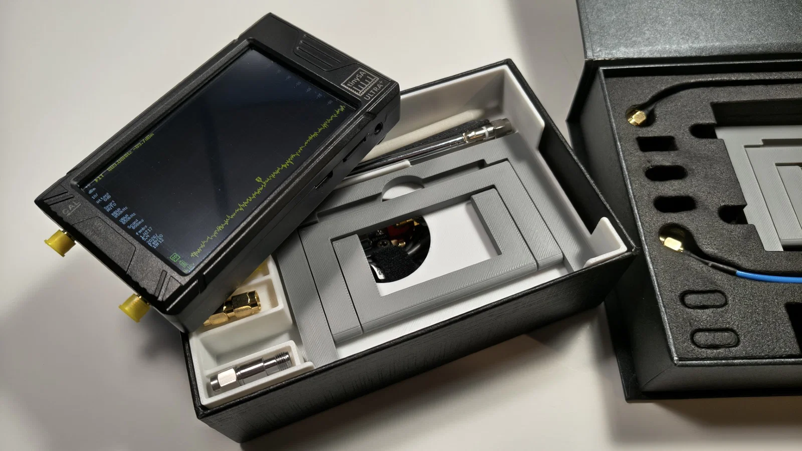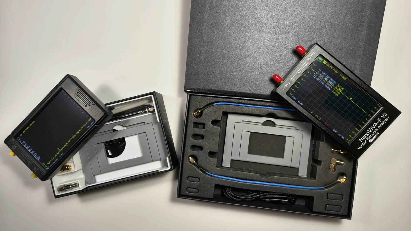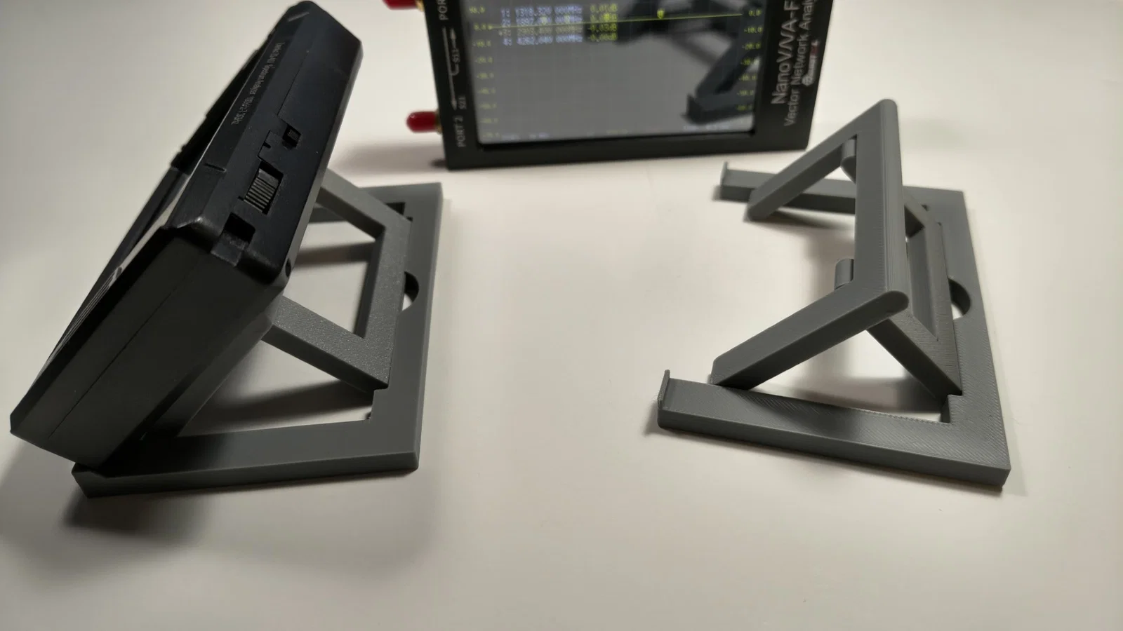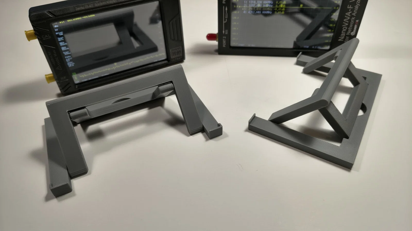 Khác nhau giữa 2 lựa chọn là: bản stand thiết kế riêng cho TinySA Ultra+ có thêm một gờ đỡ nhỏ ở mỗi bên, giúp TinySA khó bị trượt ngang. Còn bản kia mang tính chung hơn, phù hợp cho NanoVNA-F hoặc các thiết bị tương tự (thực tế cũng dùng được với TinySA Ultra+).