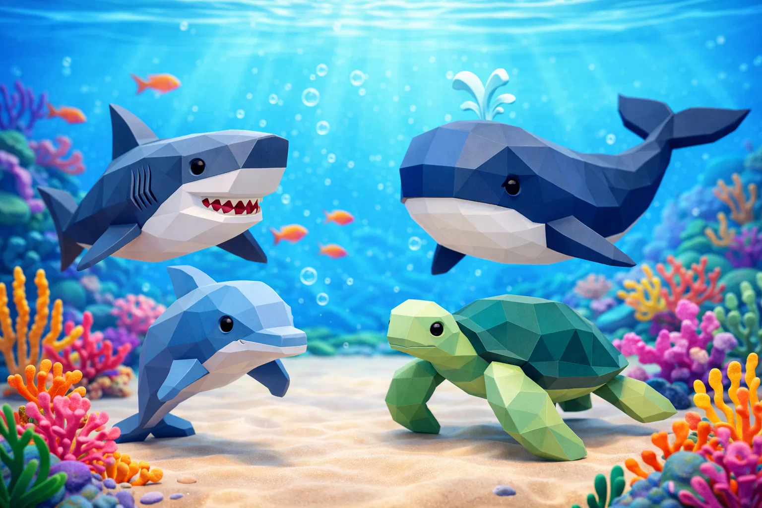 Bộ 4 mô hình thú biển low poly tối giản (cá mập, cá voi, cá heo, rùa biển) với đường nét hình học hiện đại. Tối ưu in FDM: không cần support, in nhanh, hợp in 1 màu hoặc sơn trang trí.