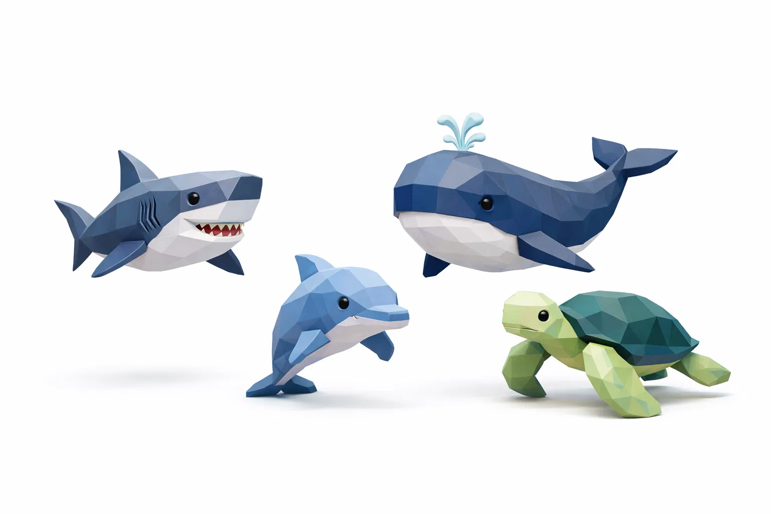 Bộ này gồm 4 mô hình thú biển phong cách low-poly tối giản, thiết kế theo kiểu hình học sạch sẽ, hiện đại: