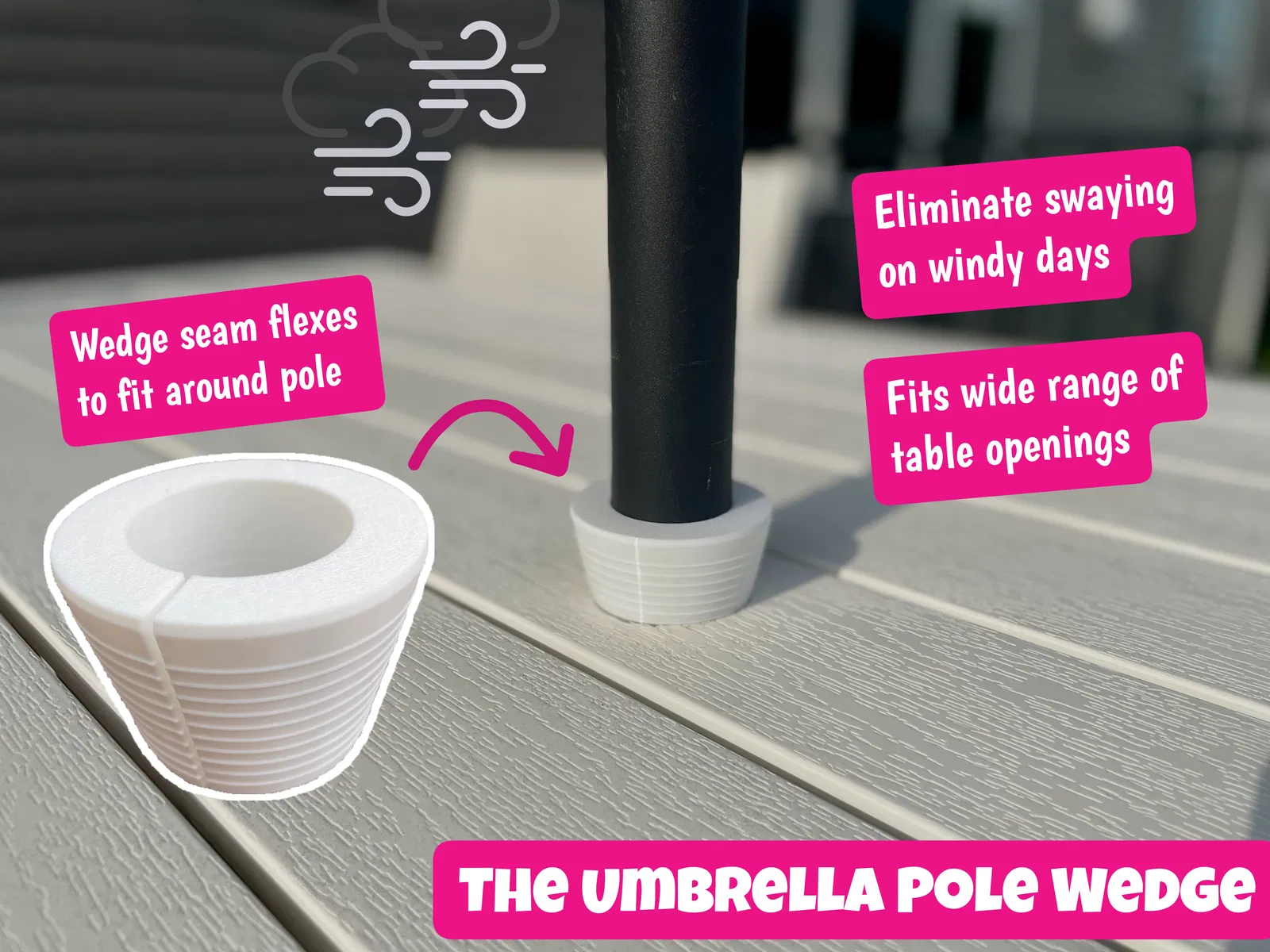 ☂ Được thiết kế để hạn chế lắc lư khi trời có gió, The Umbrella Pole Wedge là một miếng nêm (wedge) TPU dẻo và bền, giúp khóa chặt cây dù 1.5" của bạn cố định tại chỗ. Tạm biệt rung lắc, yên tâm tận hưởng buổi BBQ ngoài sân vườn lần tới!