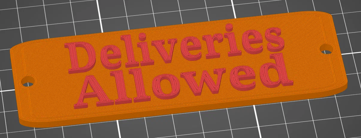 Mẫu bảng “Deliveries Allowed” giúp hạn chế người chào mời bấm chuông, nhưng vẫn thông báo cho shipper/đơn vị giao hàng là được phép bấm. Gợi ý in PETG, infill 15%, đổi màu tại 4.2 mm.