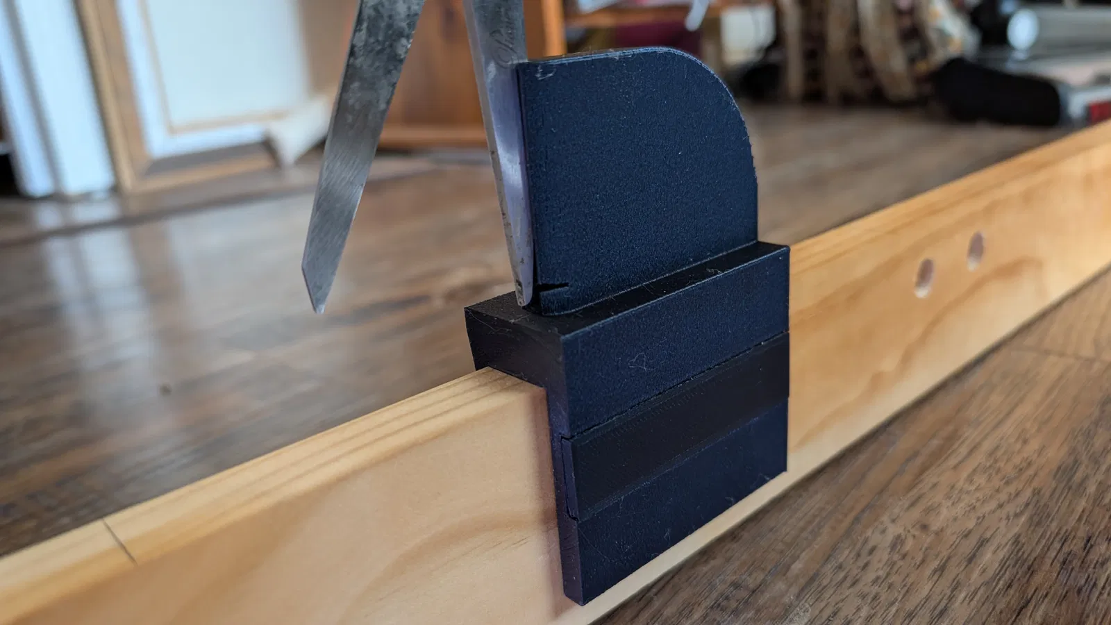Đây là một bộ jig dành cho thợ dệt để cắt các đoạn sợi (yarn) và chỉ (thread) theo đúng chiều dài cần dùng. Để lắp ráp đầy đủ, bạn sẽ cần một thanh gỗ dài loại 1x3" và một đoạn ngắn dowel 1/2". Jig có ba phần chính: end bracket (gá chặn đầu) đặt ở đầu tấm ván và giữ dowel; bracket adjustable (gá điều chỉnh) có thể trượt dọc theo chiều dài tấm ván theo nhu cầu và có một rãnh để cố định và cắt sợi; và securing rods (thanh chốt) để giữ mỗi gá cố định tại vị trí. Ngoài ra còn có một chi tiết foot (chân đỡ) tuỳ chọn để bạn in thêm, giúp jig vững hơn khi đặt trên bàn hay bề mặt khác.
