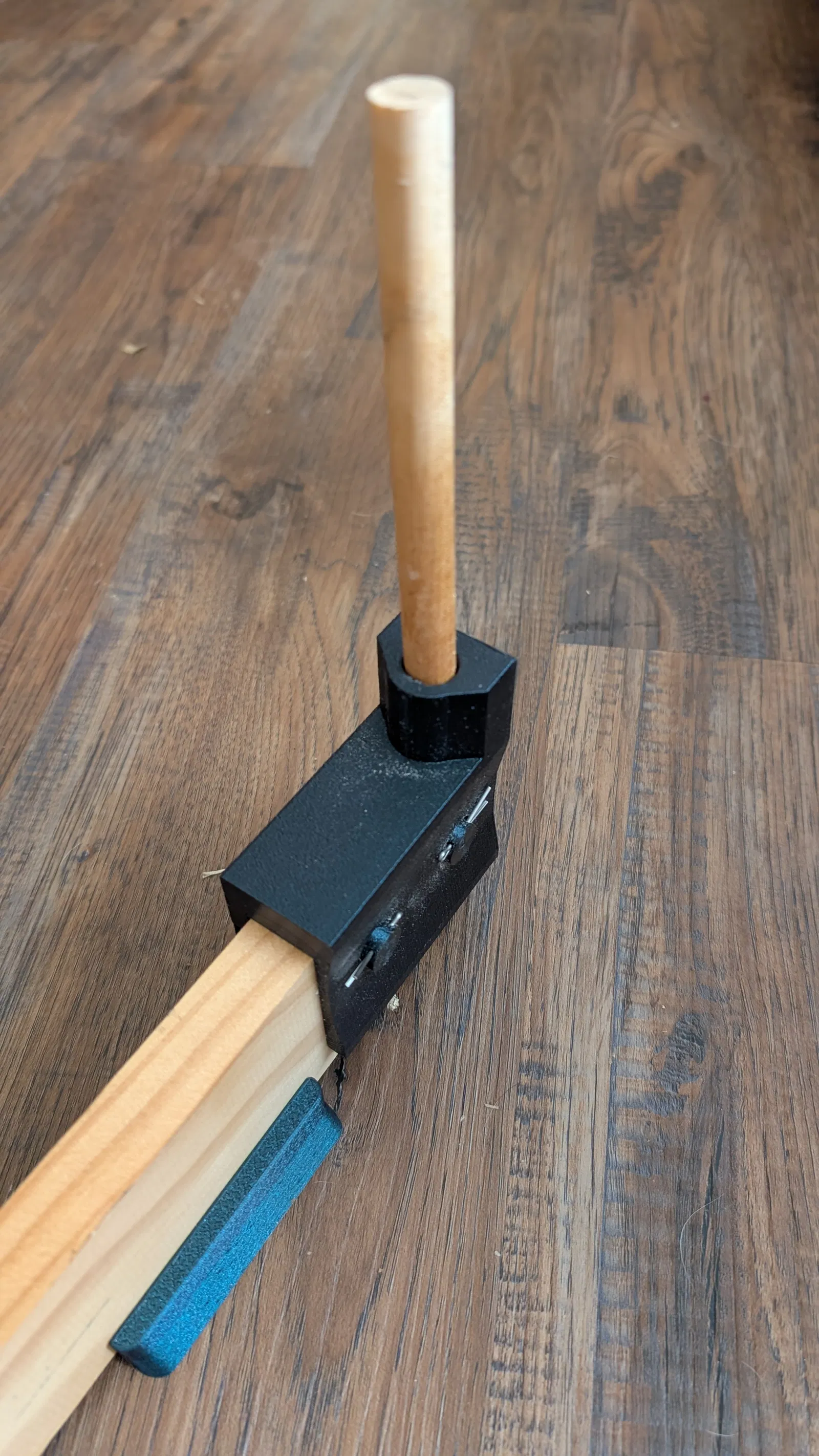Jig lắp lên tấm ván và dowel để cắt yarn/thread theo chiều dài cố định. Gồm end bracket, adjustable bracket có rãnh cắt và securing rods; tuỳ chọn thêm stabilizing feet. In PLA, dùng tree supports tối thiểu.