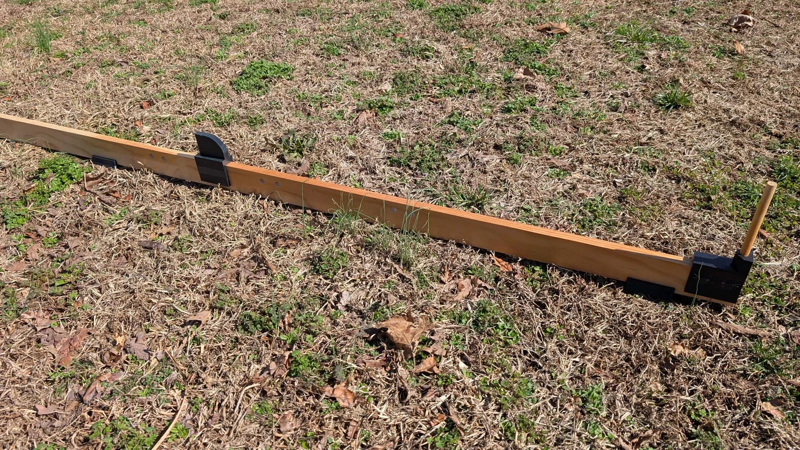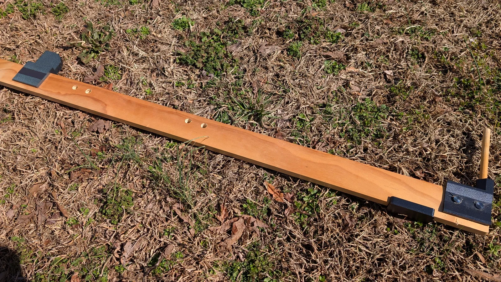 Mức độ điều chỉnh của jig là tuỳ theo nhu cầu của bạn. Với bộ jig mình làm cho vợ, mình khoan hai lỗ 1/2" cách nhau mỗi 1/2 foot, bắt đầu từ vị trí cách đầu ván 2 feet đến 4 feet. Nhờ vậy vợ mình có thể cắt sợi dài 4', 5', 6', 7' và 8' cho các dự án. Bạn có thể đặt các bracket lên tấm ván và dùng chúng như khuôn dẫn để đánh dấu/khoan lỗ. Chỉ cần nhớ đo từ dowel tới mép ngoài của adjustable bracket (ngay chỗ có rãnh cắt). Làm vậy mới đảm bảo cắt ra đúng chiều dài sợi cần dùng.