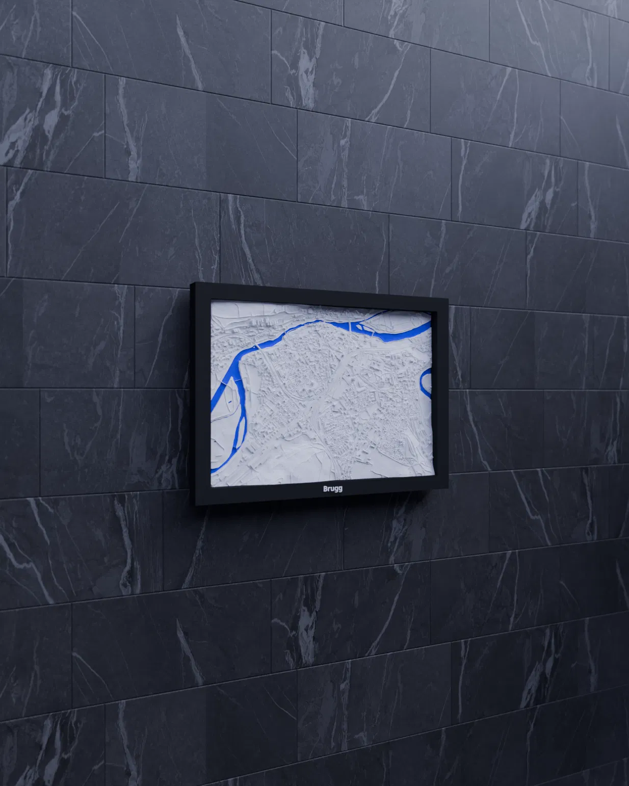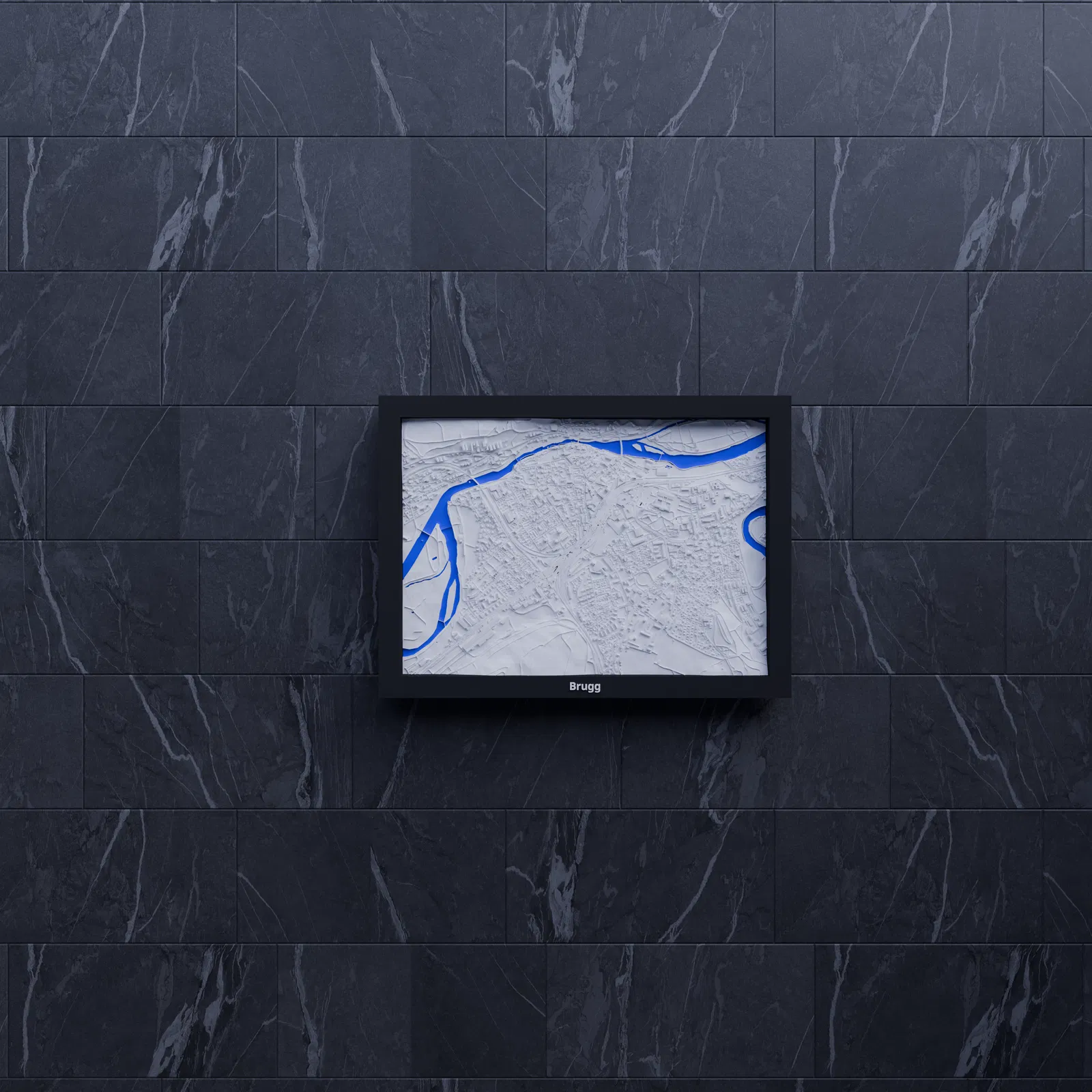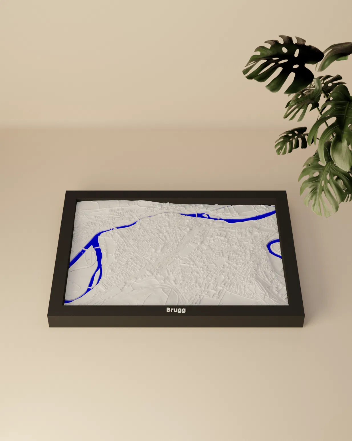 Mô hình địa hình thu nhỏ in 3D tái hiện Brugg (Thụy Sĩ) từ dữ liệu địa lý, tỉ lệ ~16533:1. Kèm STL/3MF và nhiều biến thể khung có lỗ treo, phù hợp trang trí, học tập hoặc trưng bày.