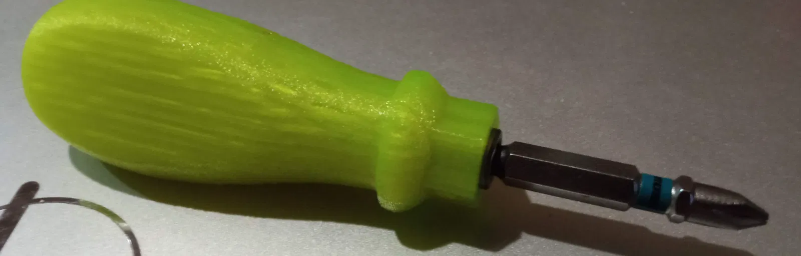 Mẫu giá đỡ bit cho tua vít, thiết kế để in bằng PETG. Phần hình trụ dài 40 mm, tổng chiều dài 60 mm. Phù hợp để giữ bit gọn gàng, dễ lấy khi làm việc.