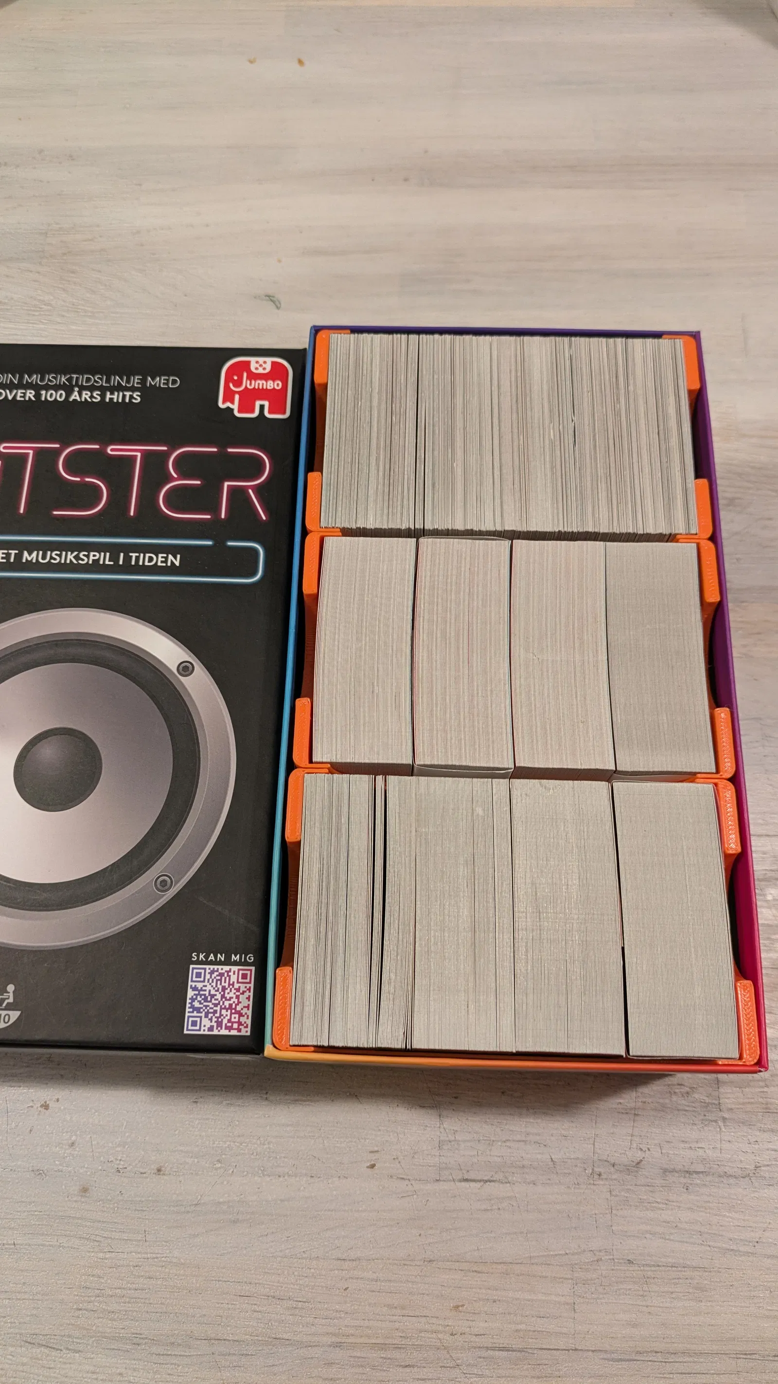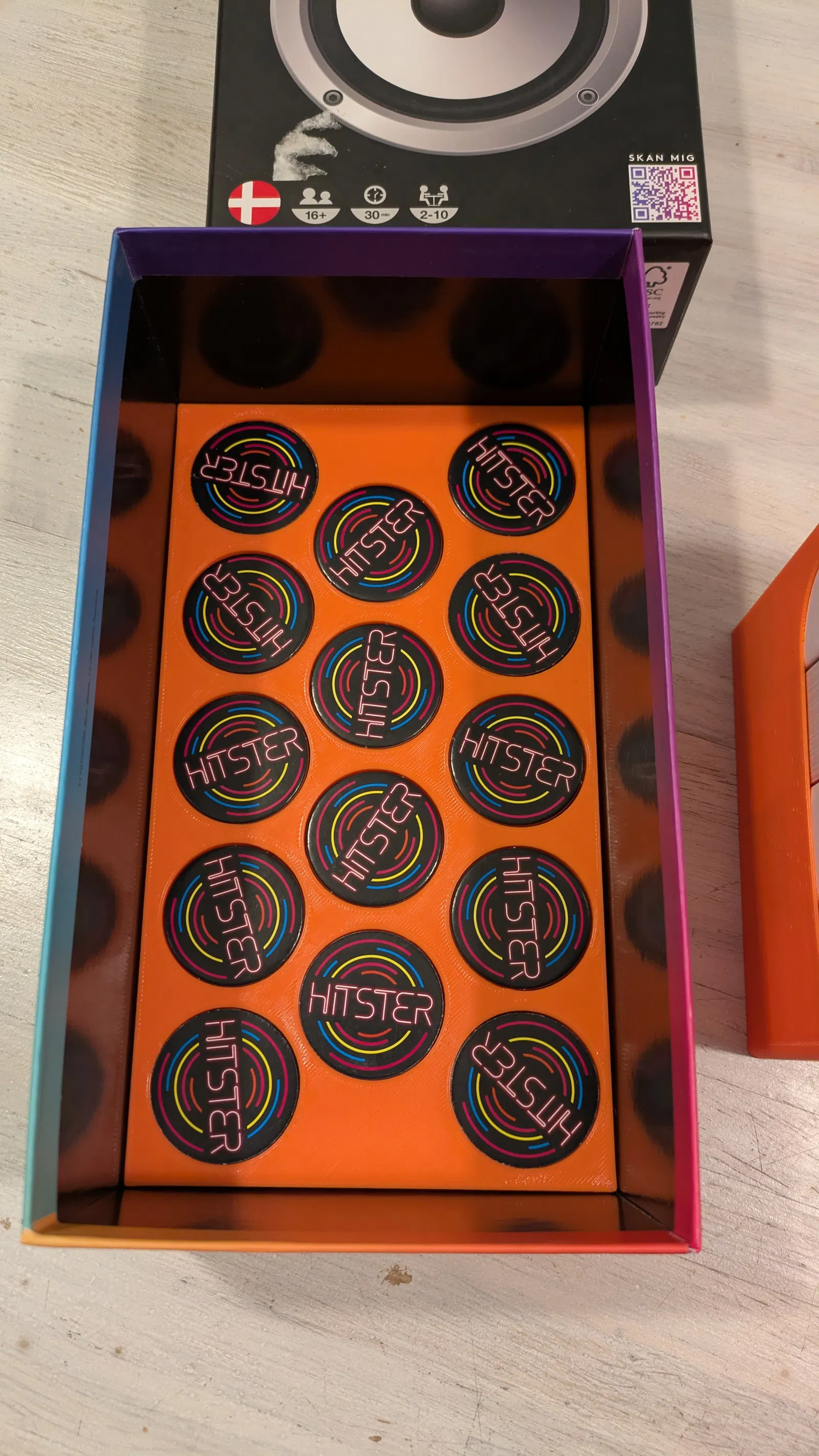 Bộ insert cho Hitster giúp gộp 3 bộ game vào cùng một hộp. Có ngăn card insert để chứa thẻ của 1 bộ, và khoang phía dưới đủ chỗ cho 45 token Hitster, giúp sắp xếp gọn gàng.