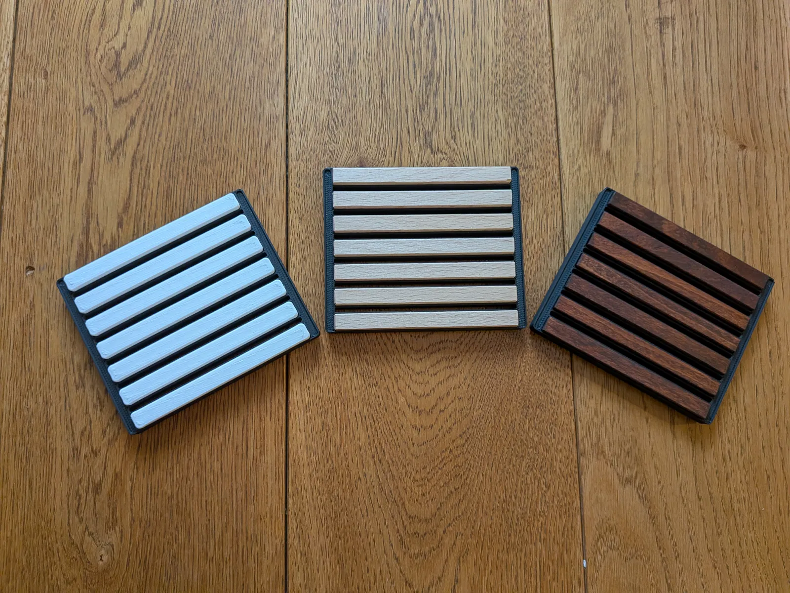 Bạn có thể thay các thanh gỗ bằng phần Coaster plank in 3D, in 7 cái cho mỗi coaster. Ưu tiên PETG hoặc vật liệu chịu nhiệt khác nếu chi tiết có thể tiếp xúc trực tiếp với ly/cốc nóng.