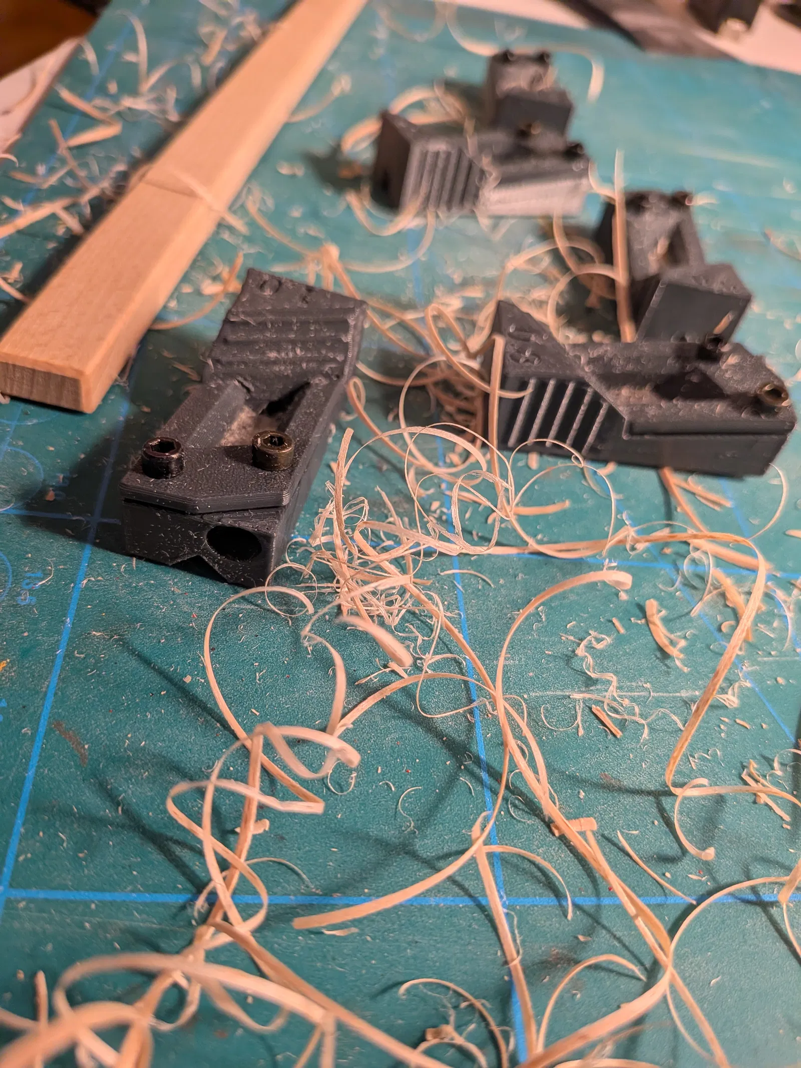 Dụng cụ này giúp bạn cắt thanh gỗ đúng chiều dài cần thiết khỏi phải đo, đồng thời giúp giữ vuông góc. Tốt nhất in bằng PETG để chịu nhiệt và ma sát từ lưỡi cưa tốt hơn.