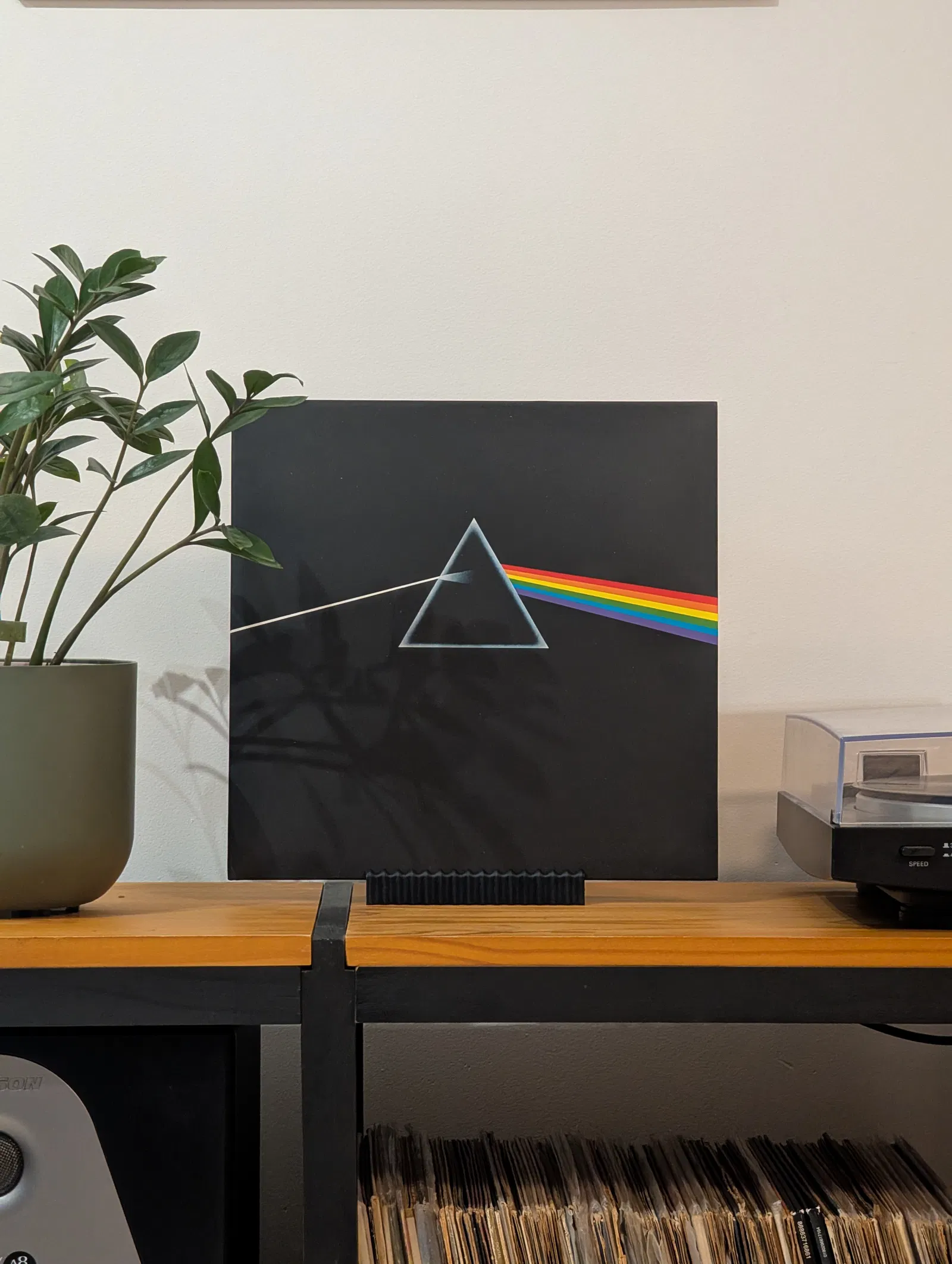 Một chiếc kệ đỡ đơn giản và đẹp mắt để trưng bày một đĩa vinyl.