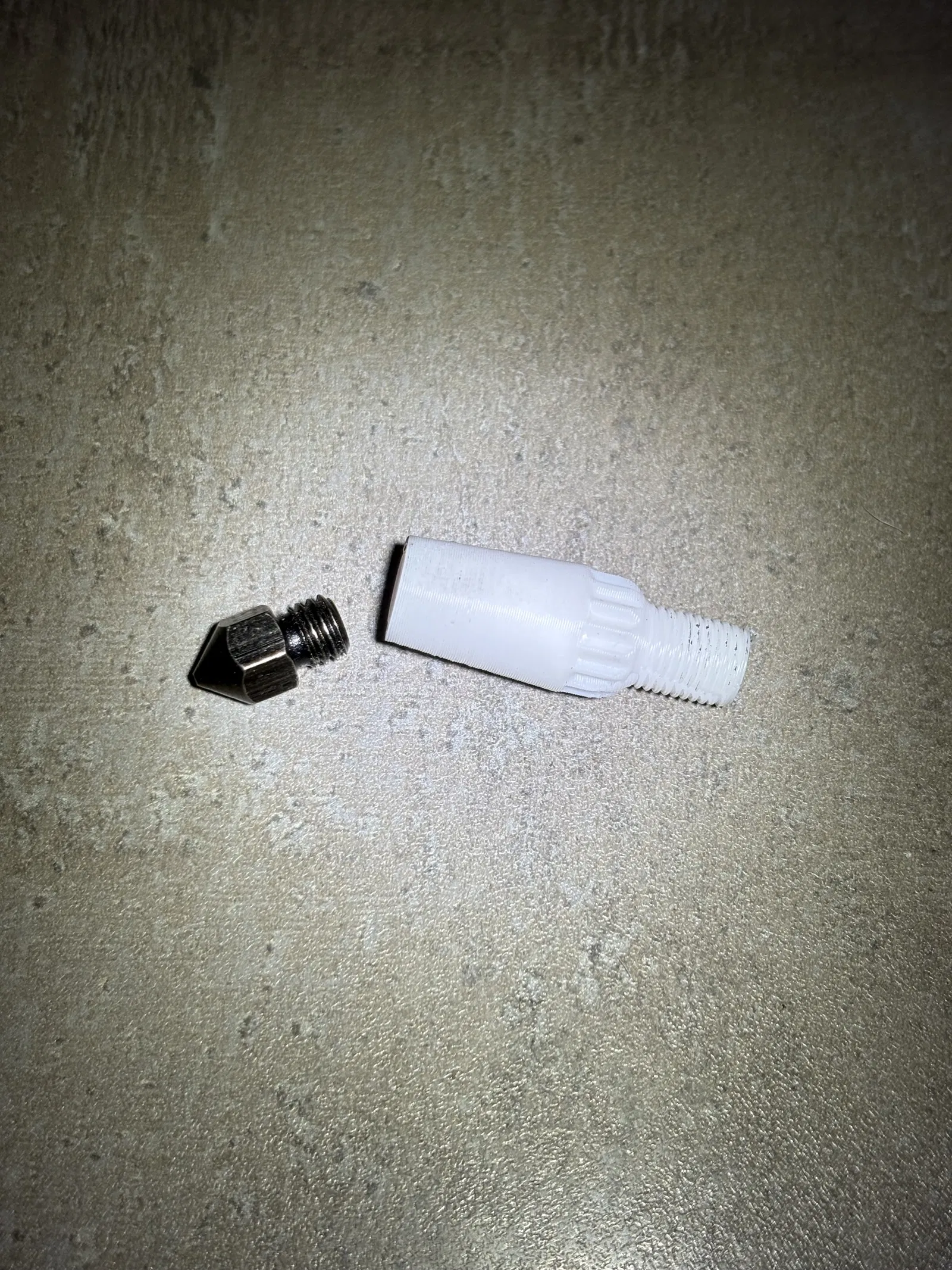 Chỉ cần in mẫu với chất lượng bất kỳ (miễn hợp lý) rồi vặn một nozzle máy in 3D tiêu chuẩn vào. Nếu bạn gặp khó khăn khi vặn nozzle vào ren, có thể dùng tap tool để chỉnh/chuốt lại ren M6.