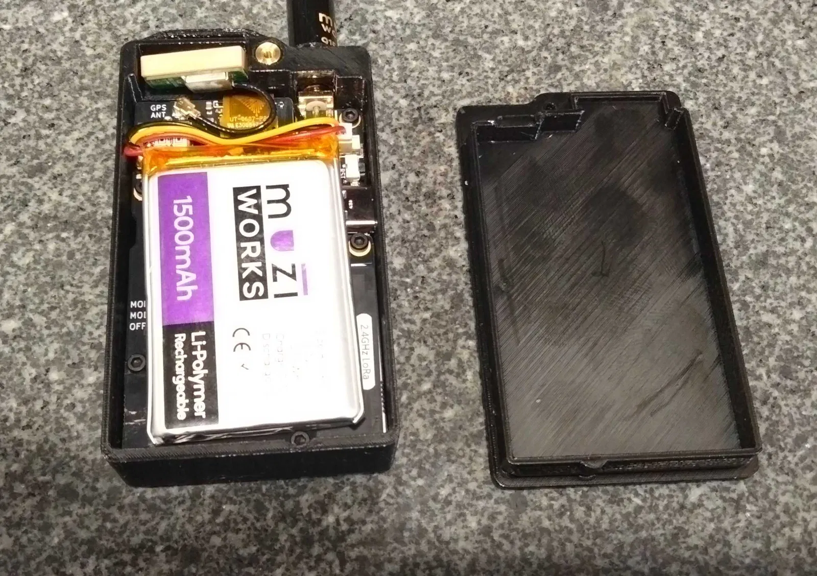 Tiếp theo, đặt pin lên trên PCB sao cho dây nằm phía trên của viên pin (khi mặt trước đang úp xuống) để đi tới đầu cắm pin. Đảm bảo dây pigtail anten 2.4GHz đi lệch qua bên hông pin, không nằm ngay bên dưới pin. Đặt GPS antenna vào phần recess trên đỉnh vỏ, để dây pigtail vòng qua bên phải rồi uốn hình chữ U về đầu cắm trên board.