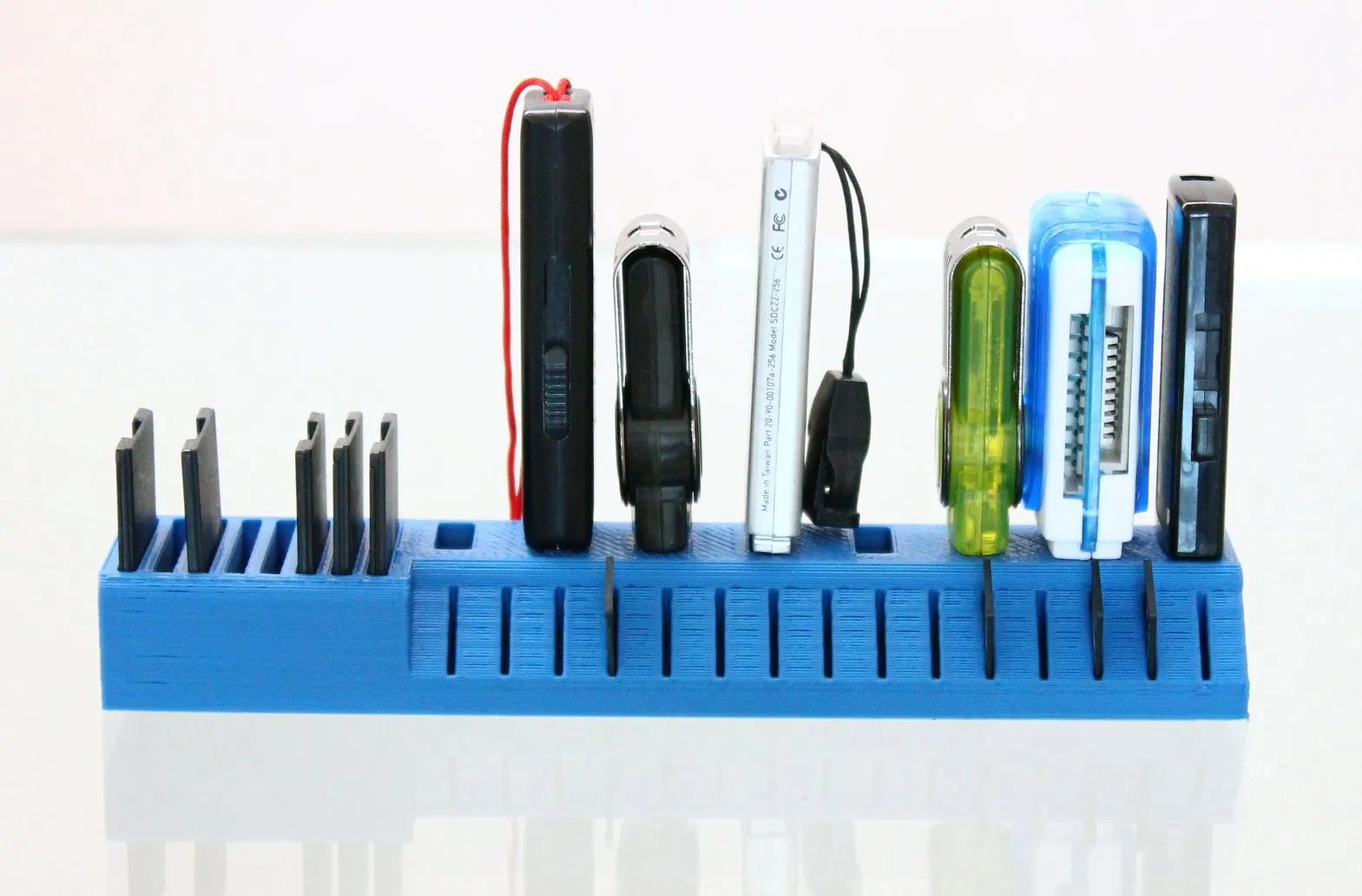 Mẫu khay giữ giúp sắp xếp gọn gàng USB dạng bản rộng cùng thẻ SD và MicroSD. Phù hợp để in 3D và dùng như một giá đỡ/holder tiện dụng cho bàn làm việc hoặc khu vực lưu trữ.
