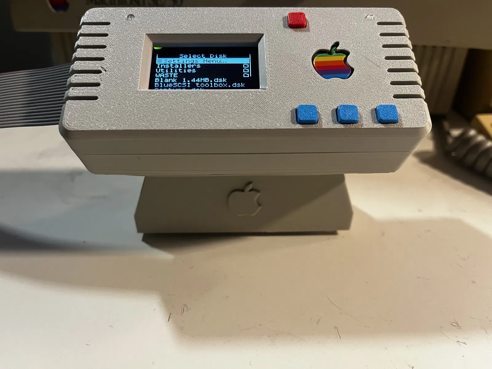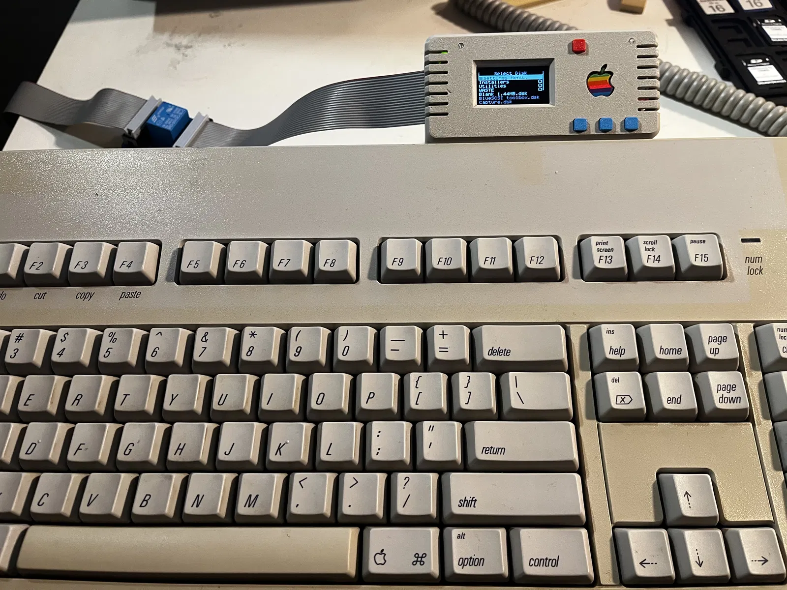 Mình remix phần đáy của vỏ Floppy Emu Apple ][ để kê lên cho ngang bằng với Apple Extended Keyboard II, giúp đặt cạnh bàn phím nhìn gọn và đồng bộ hơn. Filament: Polar Retro Platinum.