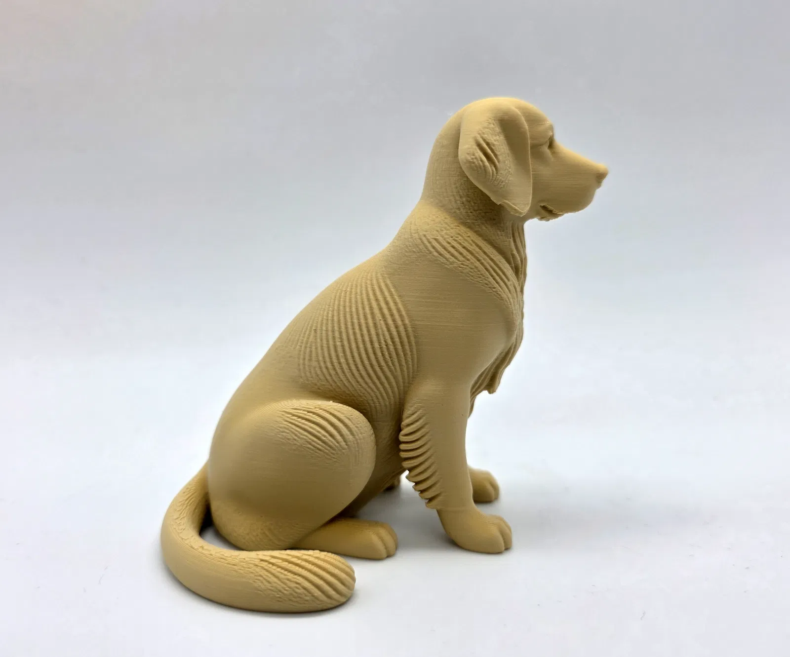 Mô hình chó Golden Retriever ngồi kiểu khắc gỗ, có thể scale linh hoạt. Đáy phẳng nên dễ bám bàn in, hầu như chỉ cần rất ít support (khuyến nghị Tree Supports trên build plate). Phù hợp trưng bày, quà tặng và sơn trang trí.