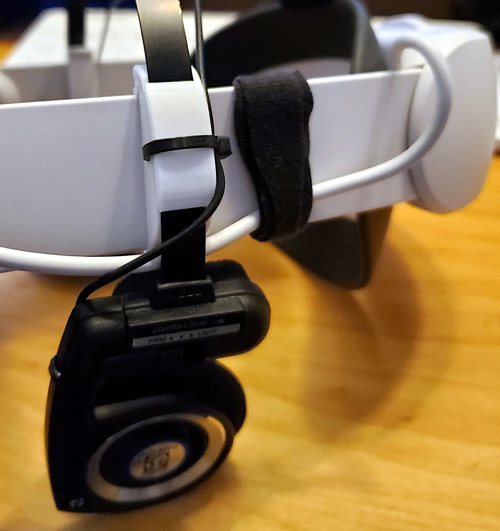 Bộ mount giúp gắn tai nghe Koss Porta Pro lên Meta Quest 3 Elite Strap with Battery, cho setup gọn gàng và chắc chắn. Có thể cũng tương thích với dây đeo stock của Quest 3.