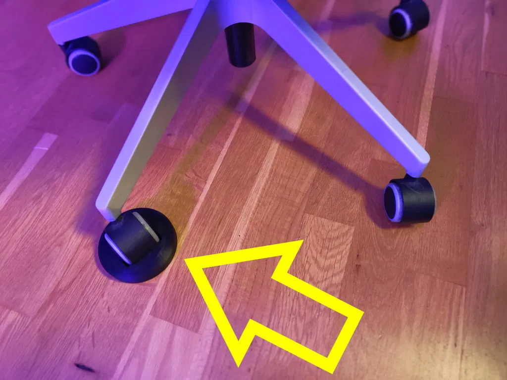 Miếng chặn bánh xe giúp ghế văn phòng đứng yên, thiết kế theo ghế IKEA Markus nhưng có thể hợp với nhiều loại bánh khác. Khuyên in TPU để bám sàn tốt; PLA vẫn dùng được nhưng có thể cần 2+ cái chặn.