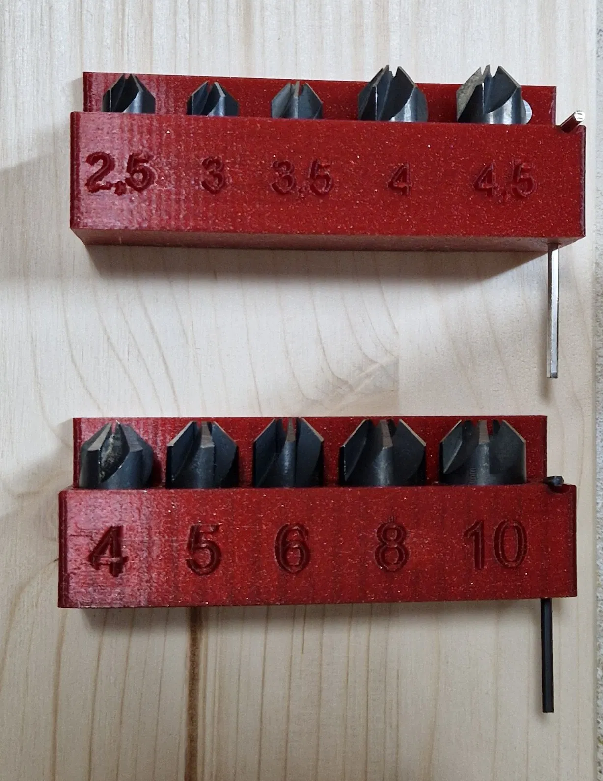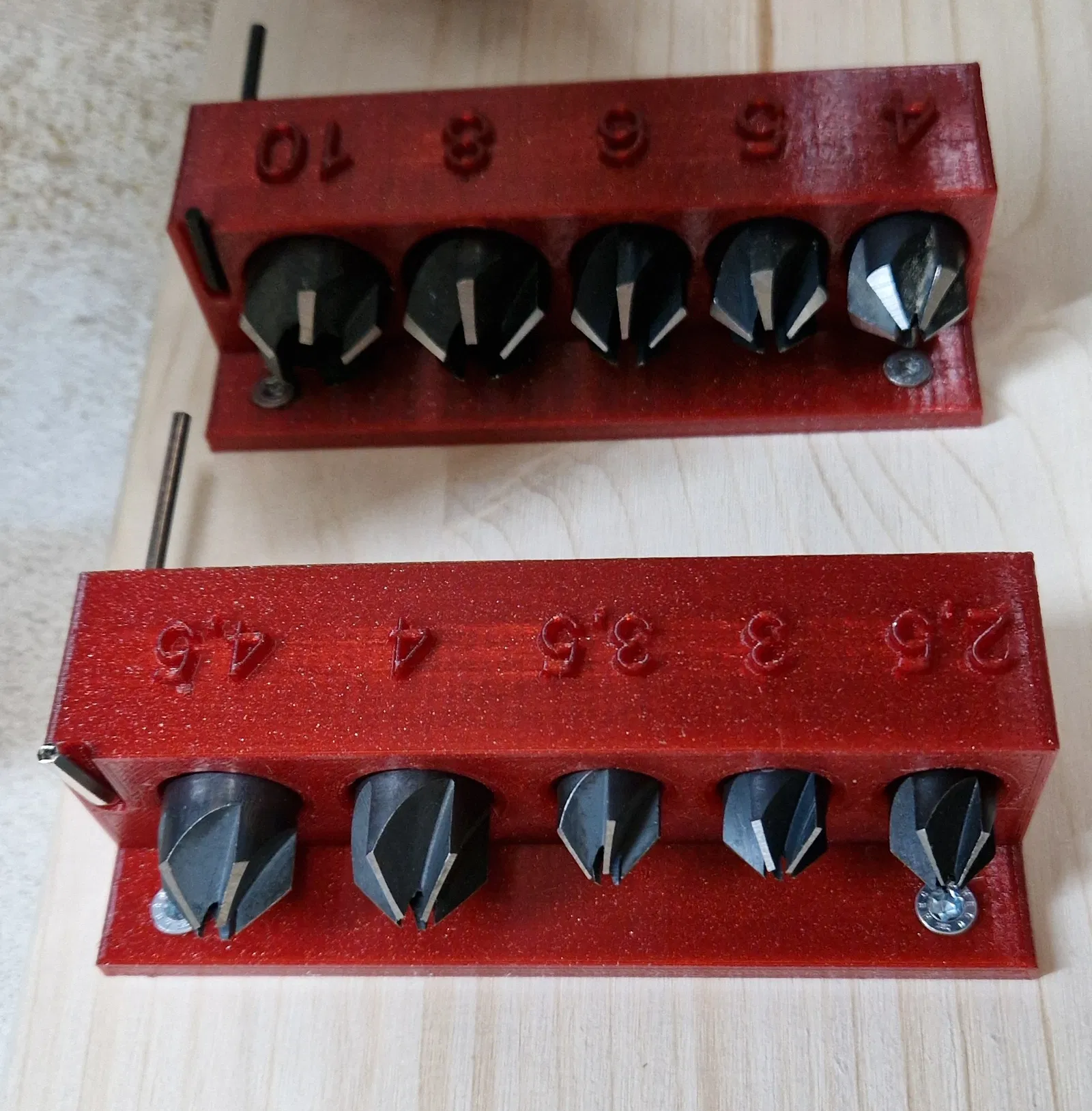Wallmount cho bộ ENT countersink sets, thiết kế để bắt vít lên french cleat hoặc tường gỗ. Mỗi bộ đường kính nhỏ và lớn có một file riêng. Có kèm chỗ cất lục giác (hex key). Lỗ bắt vít được thiết kế cho vít countersink 3.5 mm.