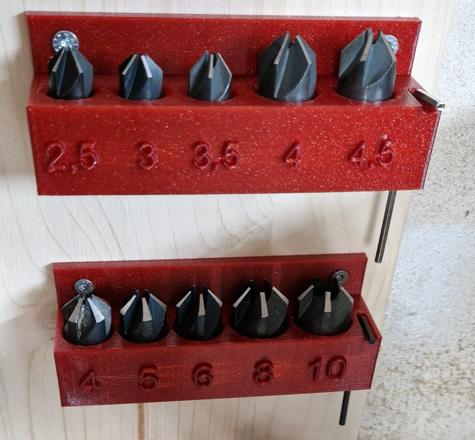 Giá treo tường cho ENT countersink sets, bắt vít lên french cleat hoặc tường gỗ. Có 2 file riêng cho bộ đường kính nhỏ và lớn, kèm chỗ cất hex key. Lỗ vít chuẩn cho vít countersink 3.5 mm.