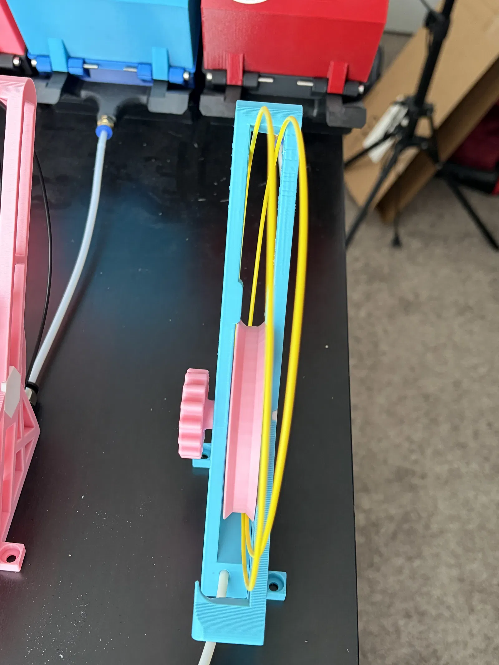 Mình rất thích mẫu buffer gốc của Jaketw47, nhưng mình không thể hoàn tất một bản in mà không bị kẹt filament, khiến mình phải canh chừng suốt quá trình in để đảm bảo chuyện này không xảy ra. Mình đã thêm một phần guide ôm sát bánh xe để ngăn filament bị kéo vào và mắc kẹt.