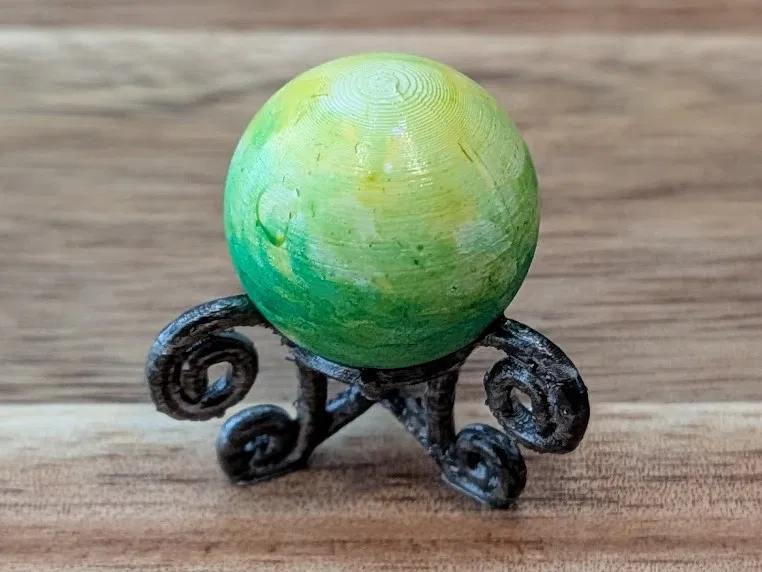 Đây là một mẫu cho Glowing Orb! Lúc đầu mình hơi bí, không biết làm sao để nó trông “ra hồn” hơn ngoài việc chỉ là một cái cầu. Cuối cùng mình chốt phương án làm một cái bệ kiểu wrought iron để đỡ quả cầu. Nói chung in cũng khá dễ, chỉ có ba “đảo” cần support thôi!