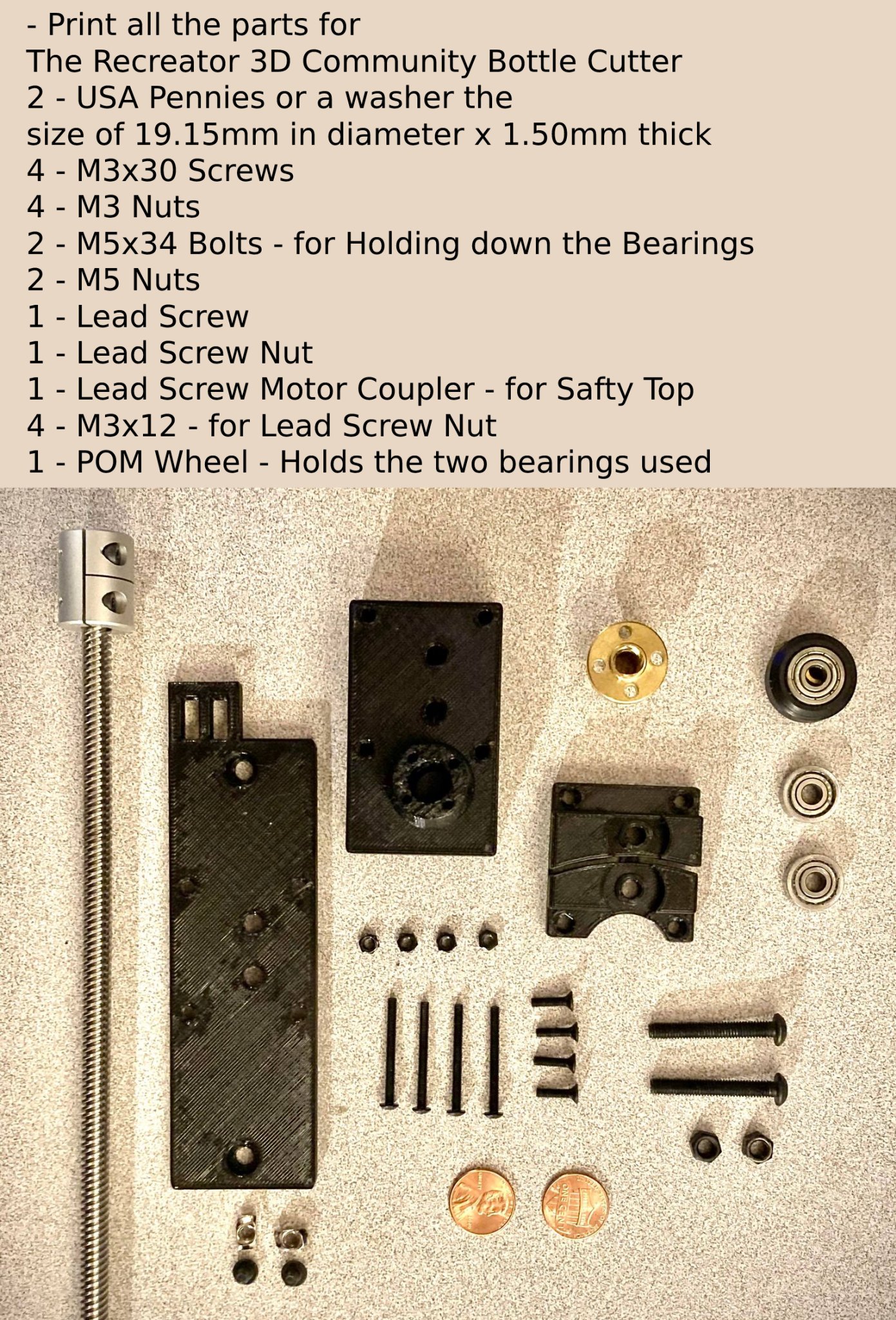 In tất cả các bộ phận cần thiết cho Cắt Chai Cộng Đồng 3D trước khi lắp ráp.