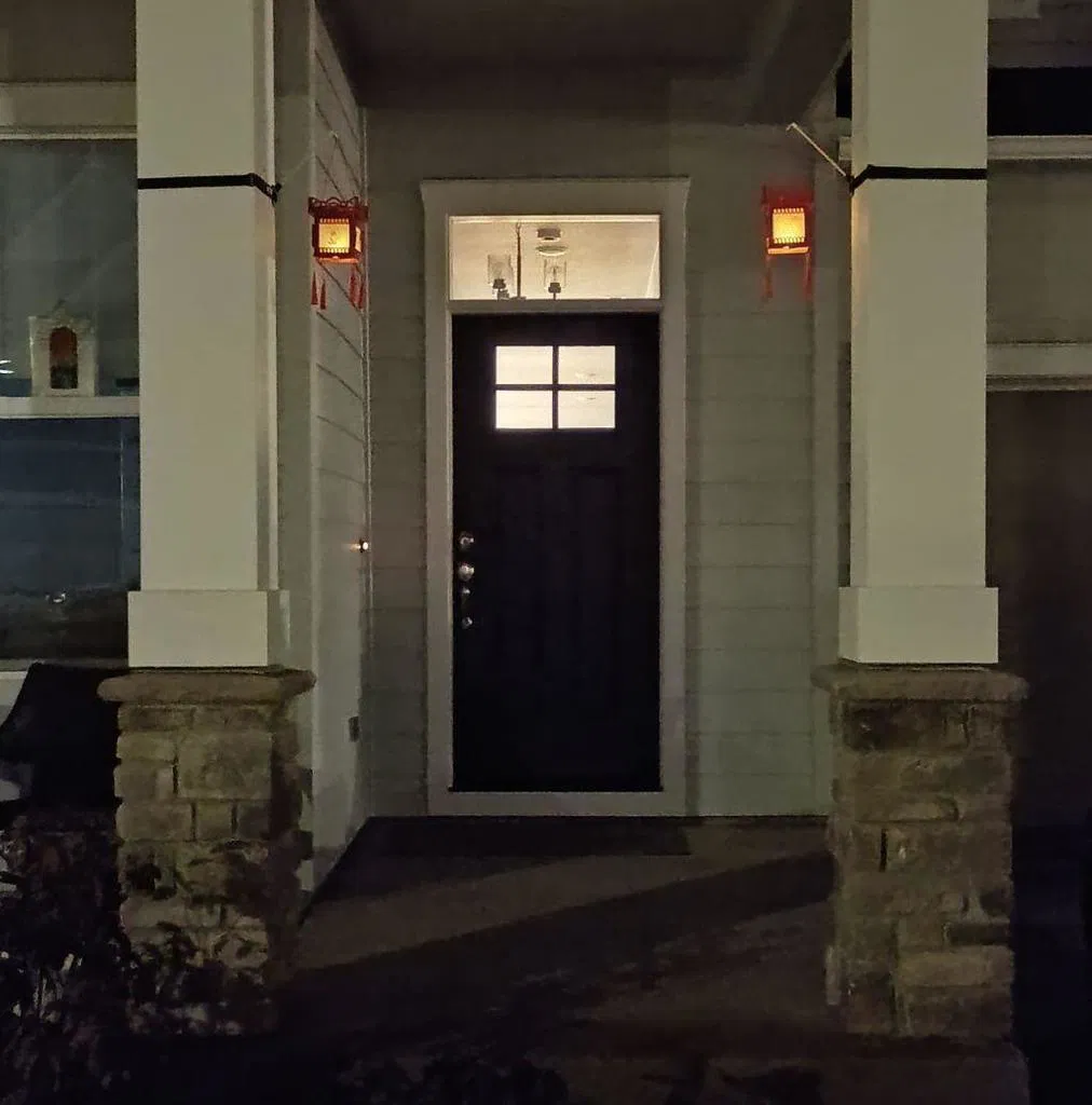 Hôm nay mình đi hội Tết Nguyên Đán (Chinese New Year) với mấy bé. Tụi nhỏ làm lồng đèn. Trên đường về mình nảy ra ý tưởng gắn tạm lồng đèn ra phía trước nhà.