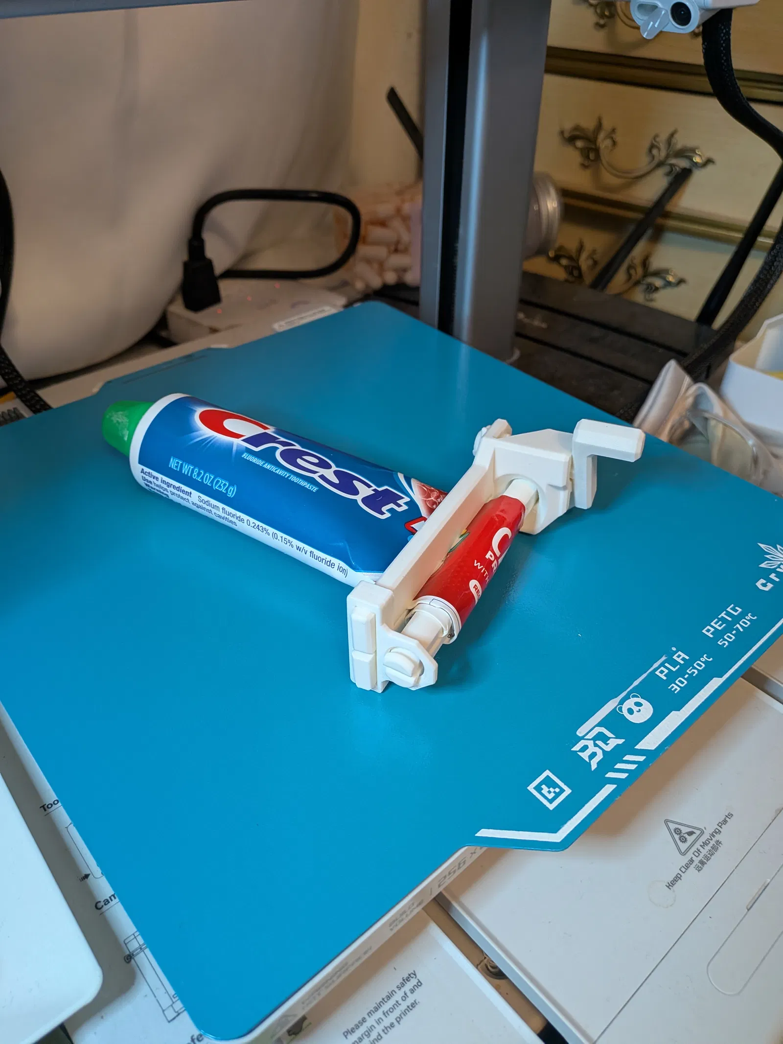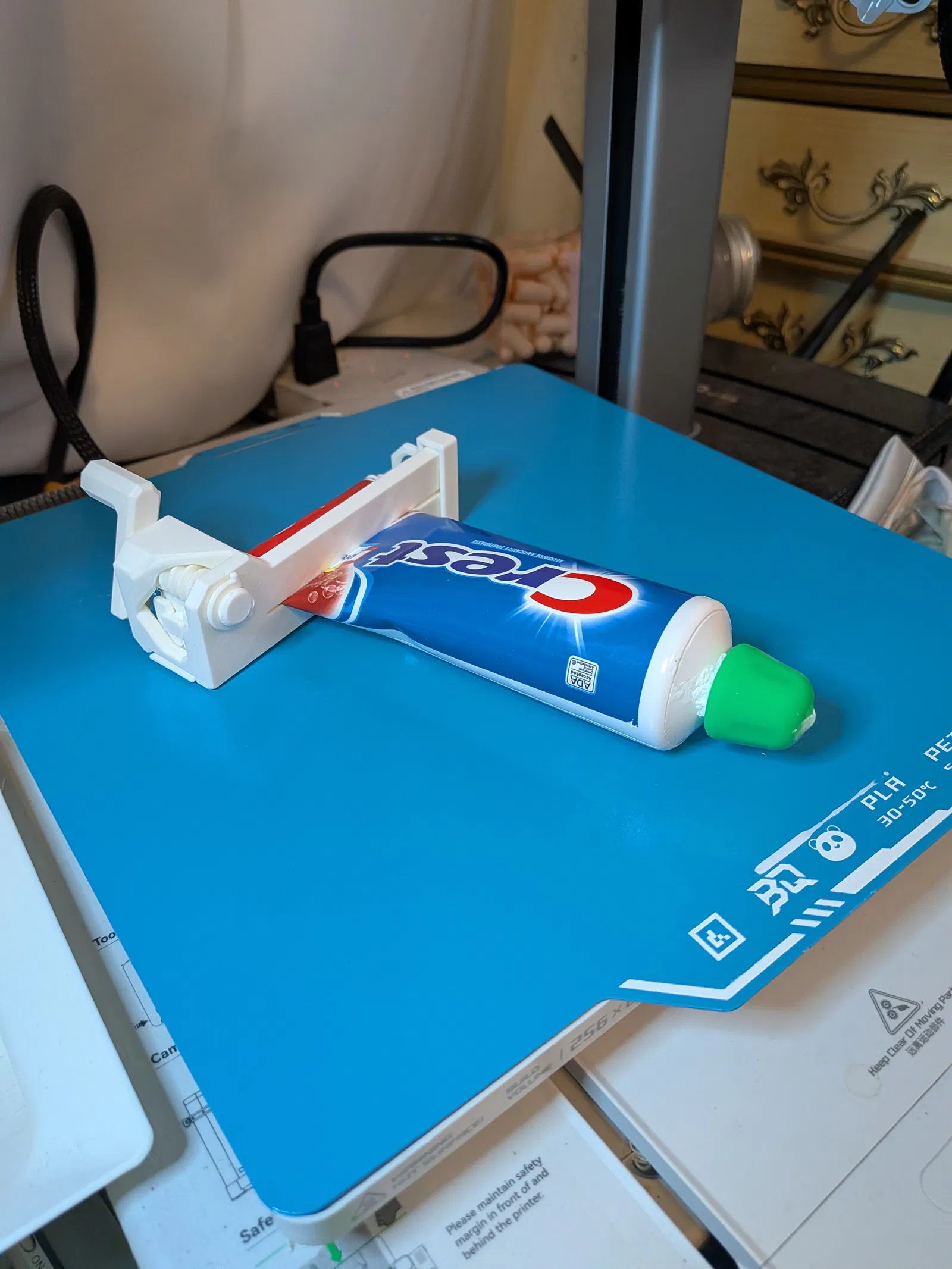 Mẫu dụng cụ bóp kem đánh răng dùng cơ cấu worm gear với kiểu quick change, giúp đưa ống vào và tháo ống ra nhanh chóng. Lắp ống giữa roller và frame, gắn end piece để khóa; bóp roller để tháo.