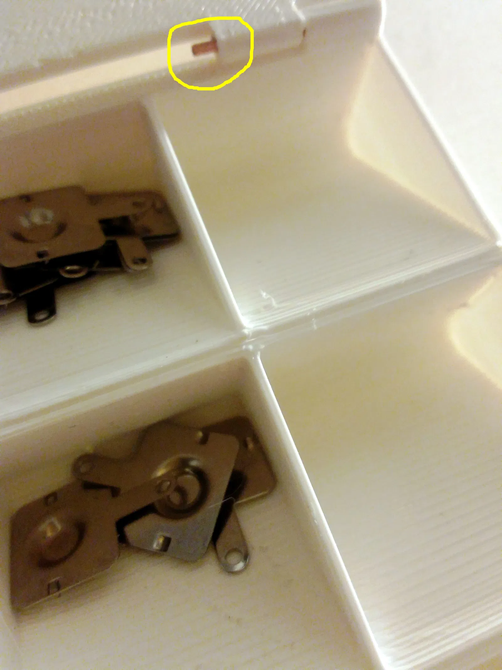 Hộp gom/hộc đựng chi tiết nhỏ với các ngăn vát nghiêng giúp lấy đồ dễ hơn khi ngón tay khó kẹp. Nắp dùng bản lề cố định bằng dây đồng 1,5 mm² (AWG16) và khóa friction closure. In PLA với cài đặt mặc định.