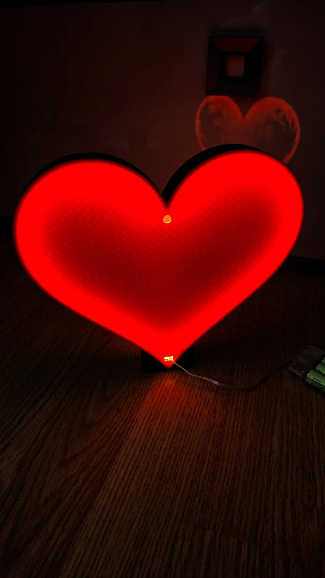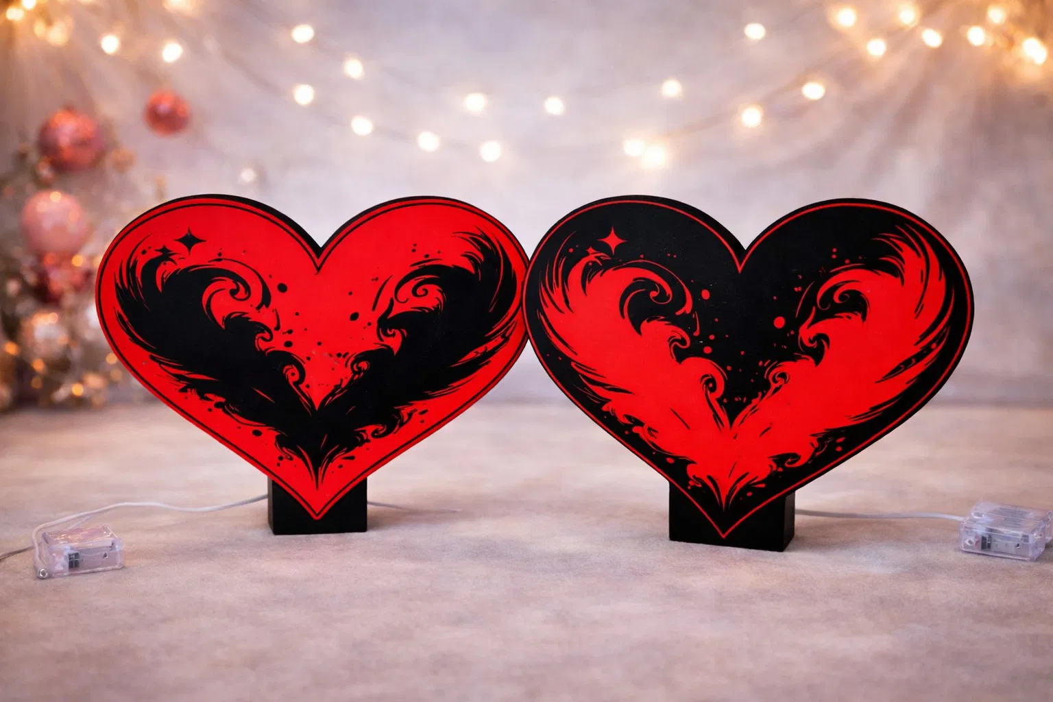 Mẫu Wings Heart Lamp Red Back dạng đèn/Lightbox với mặt lưng màu đỏ. Khuyến nghị dùng LED COB warm và dán aluminium foil phía sau để ánh sáng hắt đều hơn. Nên dùng print profile trong Bambu Studio để tránh lỗi khi in.