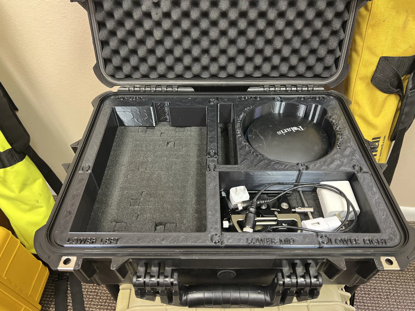 Khay đệm/organizer thay lớp foam trên của vali cứng Harbor Freight Apache 4800, để cố định tablet lớn và anten GPS Polaris S100, đồng thời có chỗ cho pin dự phòng và phụ kiện như kẹp, cáp.