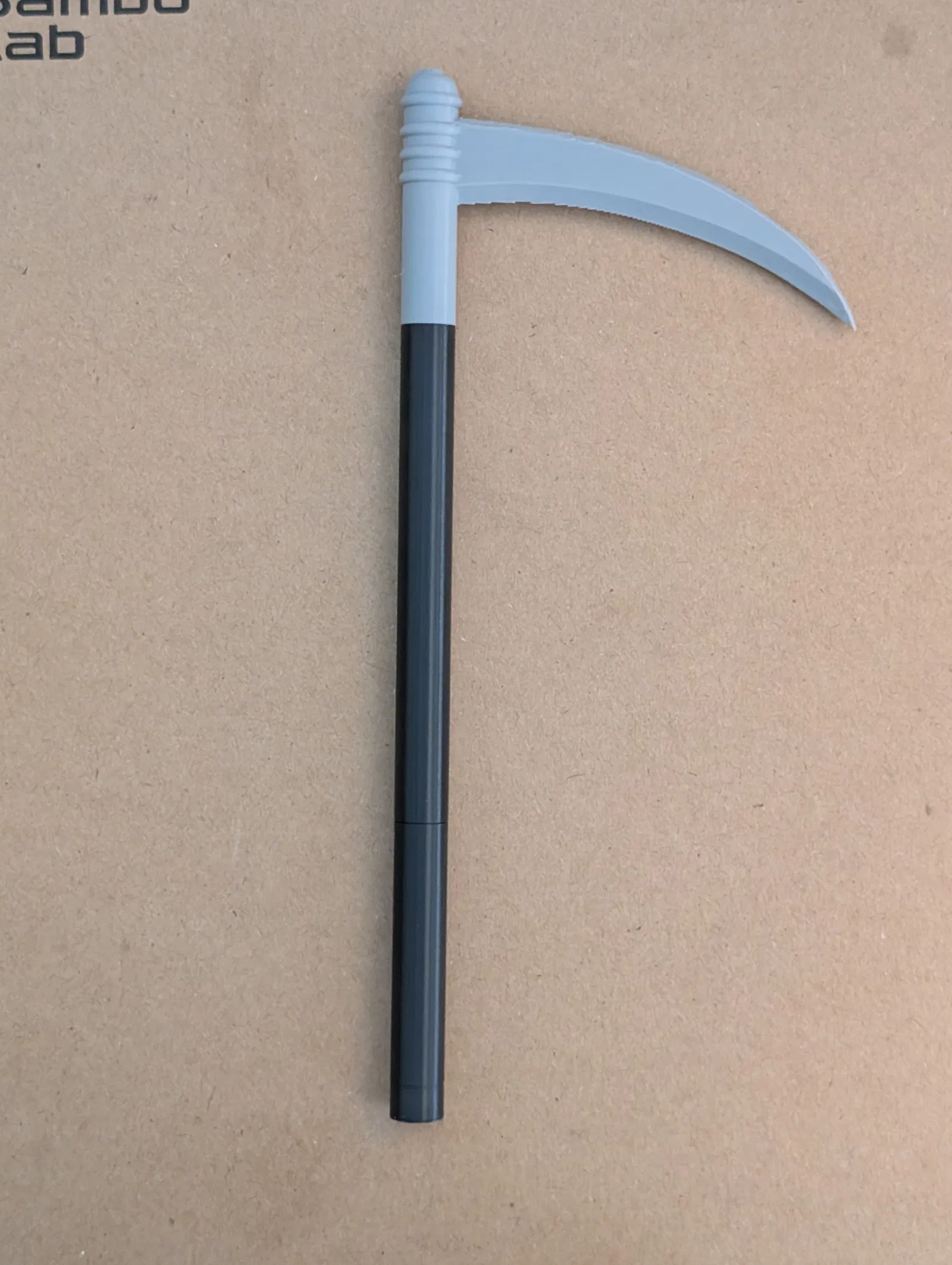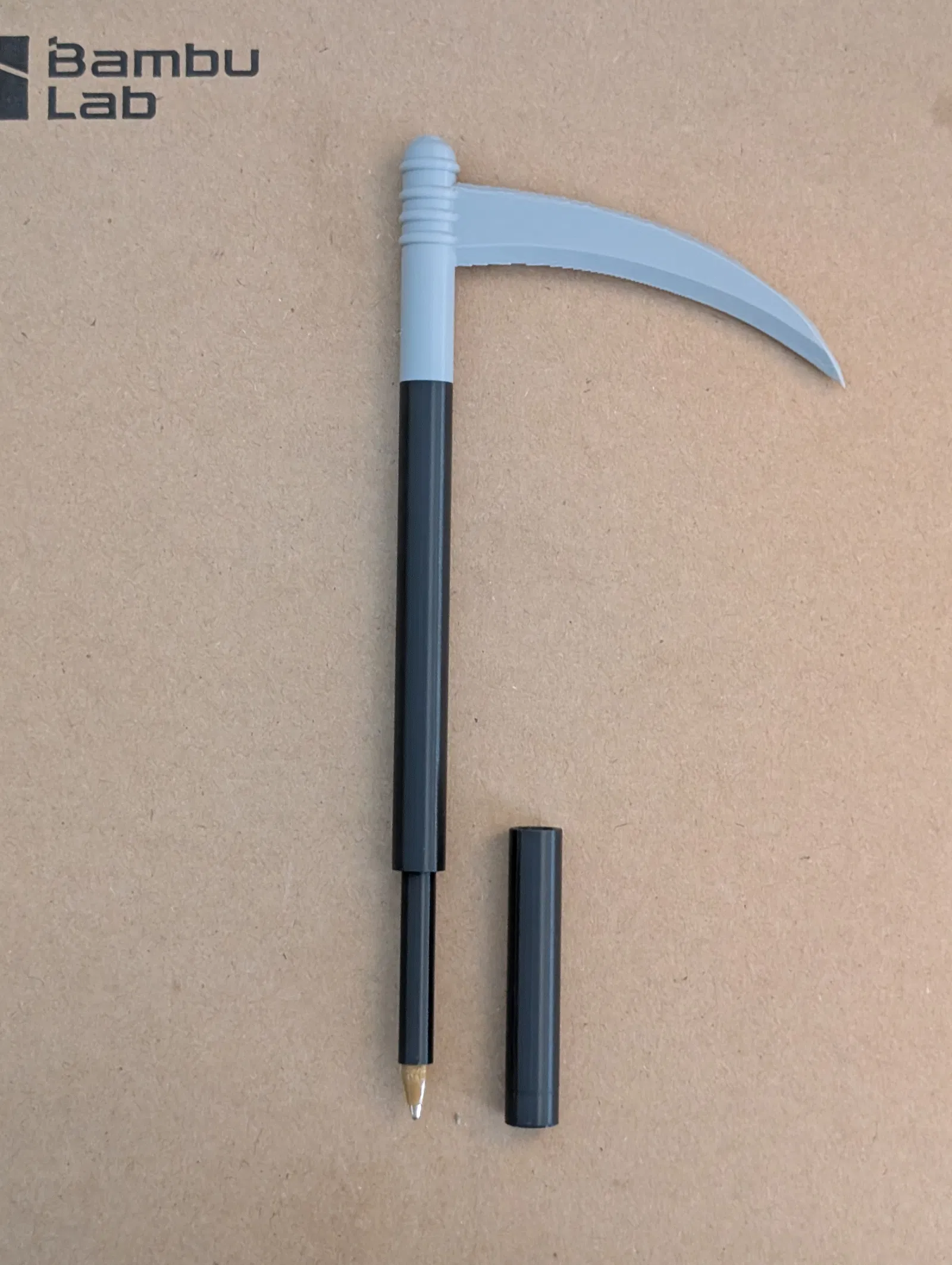 Vỏ (shell) in 3D cho ruột mực bút bi BIC, tạo hình cây lưỡi hái Grim Reaper. Dài 7 inch, cán đường kính 0.375 inch. Nắp chụp khít; nên vặn nhẹ khi tháo/lắp.