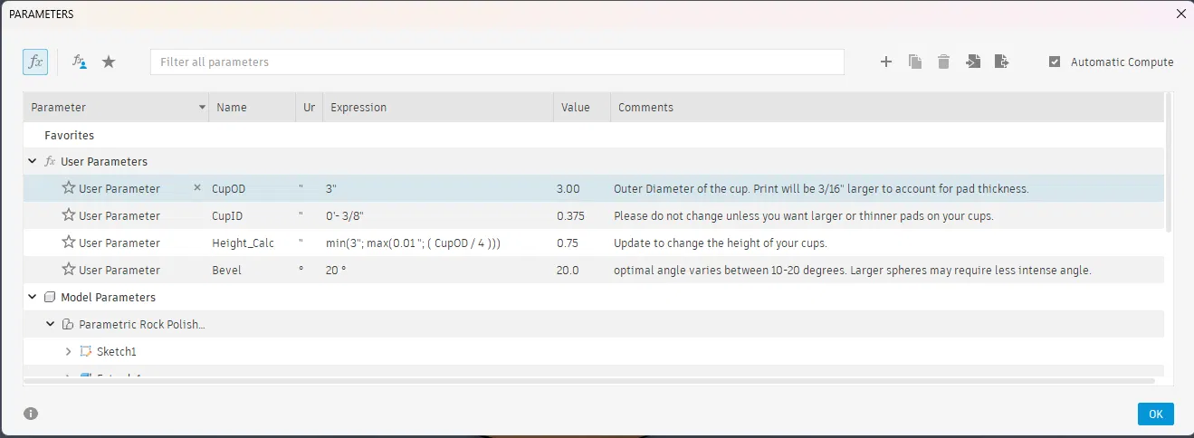 Mẫu Parametric Rock Polishing Cup: cốc in 3D dùng để đánh bóng đá hình cầu. Thiết kế parametric dễ chỉnh kích thước (CupOD trong Fusion 360), hỗ trợ setup gọn hơn và tối ưu hình học mài.