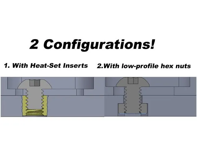 Có hai cấu hình cho thiết kế này. Một cái sử dụng các chèn nhiệt, một cái sử dụng các bu lông dài hơn một chút vào các đai ốc lục giác thấp.